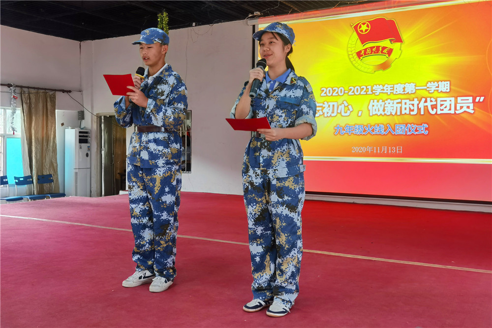 14日下午,“不忘初心,做新时代团员”九年级火线入团仪式在基地礼堂隆重举行。新团员佩戴上熠熠生辉的新团徽,宣誓加入中国共产主义青年团,为共产主义事业而奋斗。