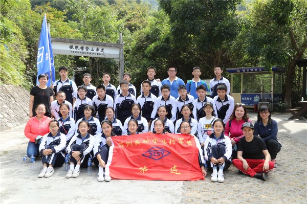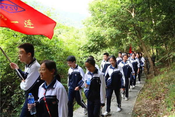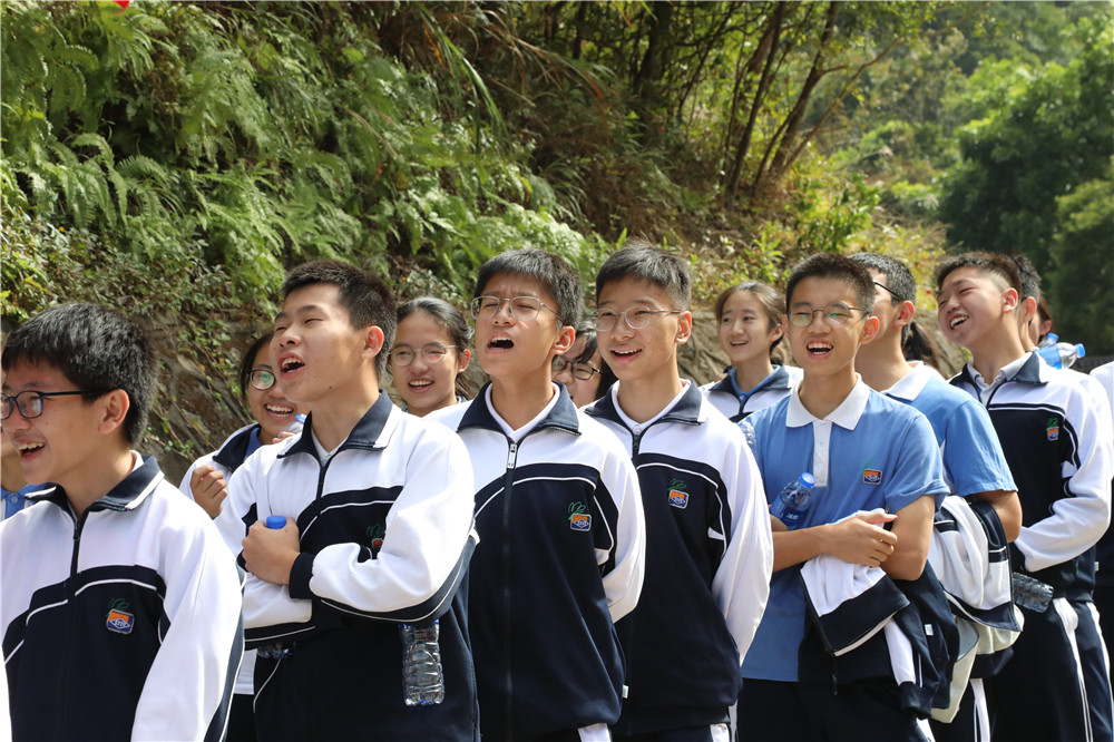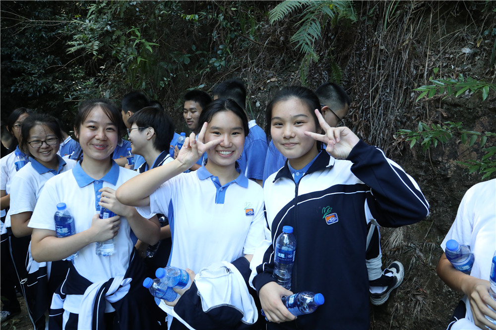 山间空气清新,流水潺潺。同学们军歌嘹亮,士气高傲。师生们矫健的身影穿行在林间路上。脸上都洋溢着欢快的笑容,早已忘记了登山的疲惫。