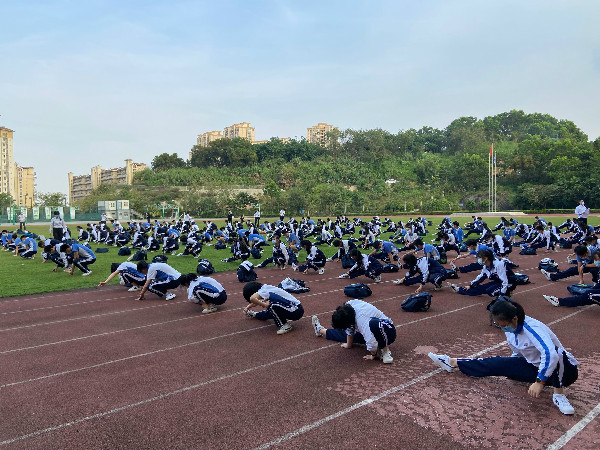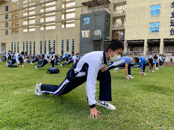 阳光体育时间,同学们在体育老师的带领下做适度的体育锻炼。