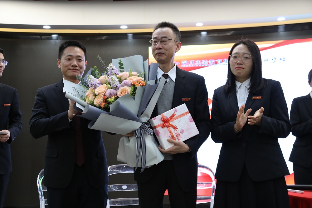 在本次教工大会上,坂田部还为来坂田支援的实验首批骨干教师杨鹏举行了简朴隆重的欢送礼。在大家的祝福声中,青年教师代表宋高飞为杨鹏老师献上了鲜花,赵晓主任代表学校为杨鹏赠送了纪念品。