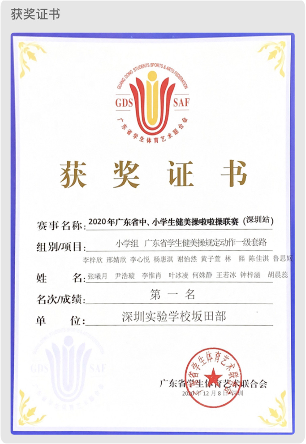 ——坂田部健美操队荣获广东省学生健美操规定动作一级套路小学组第一名