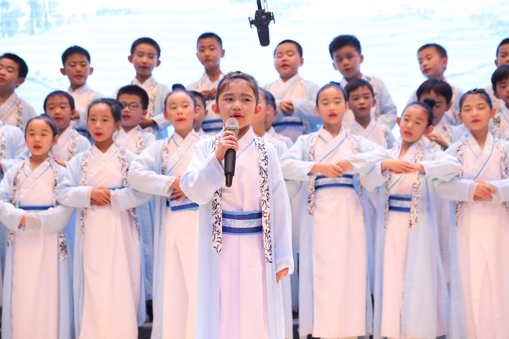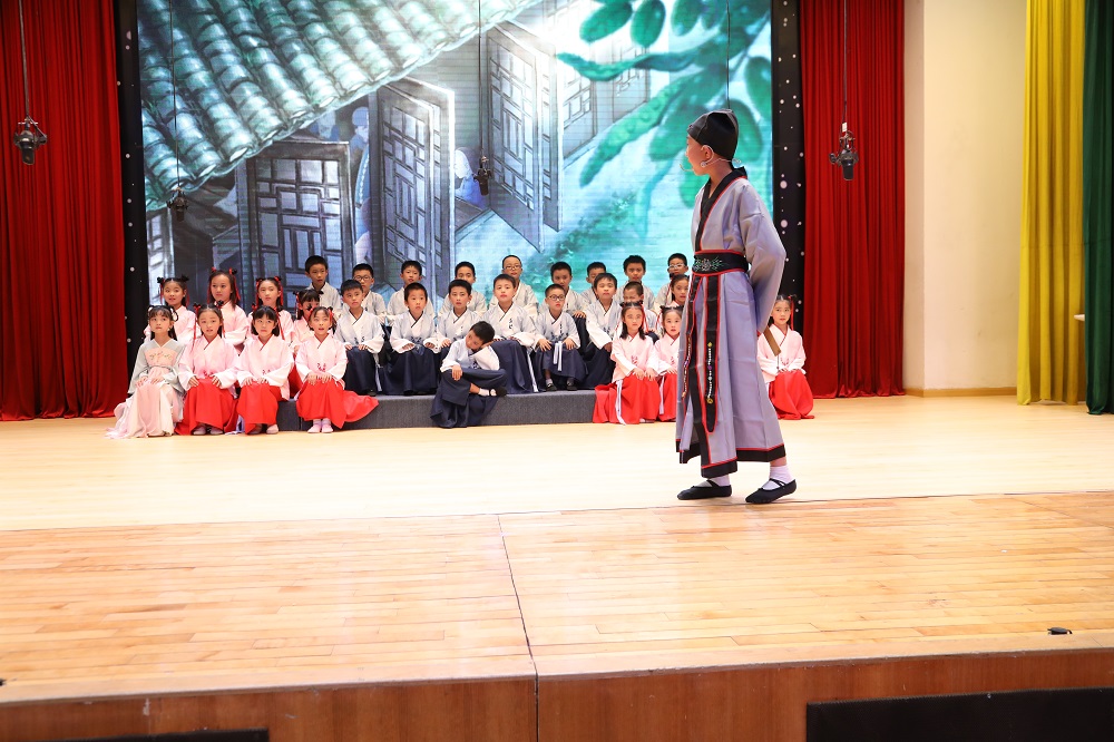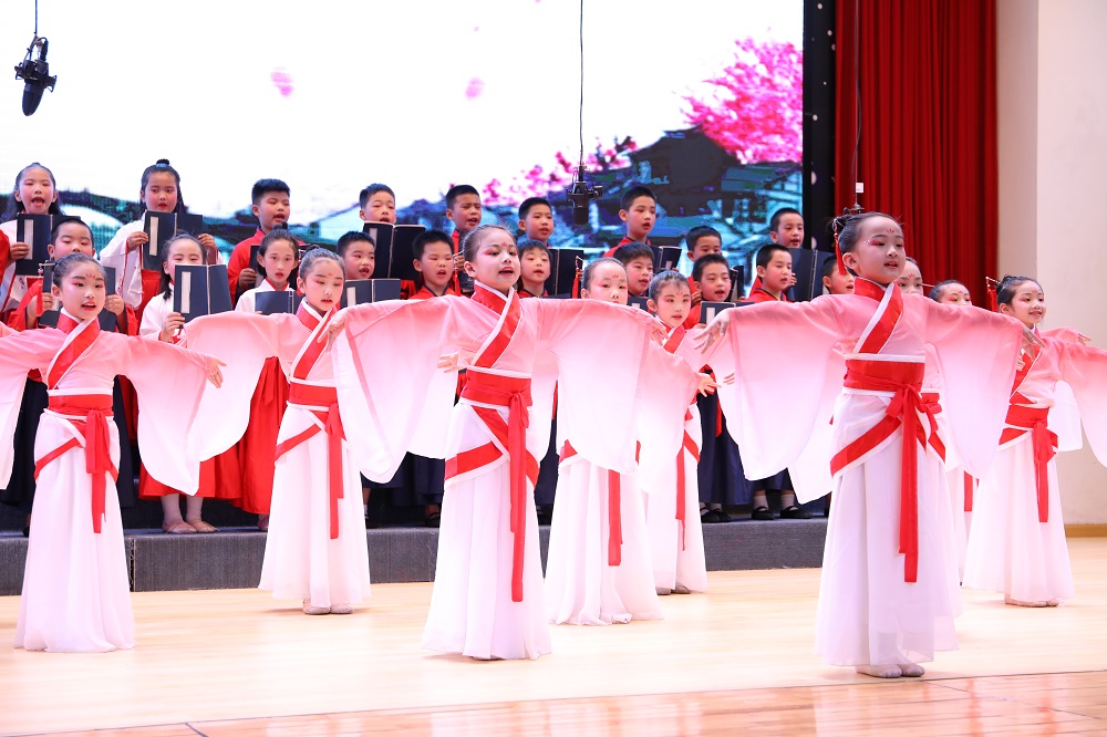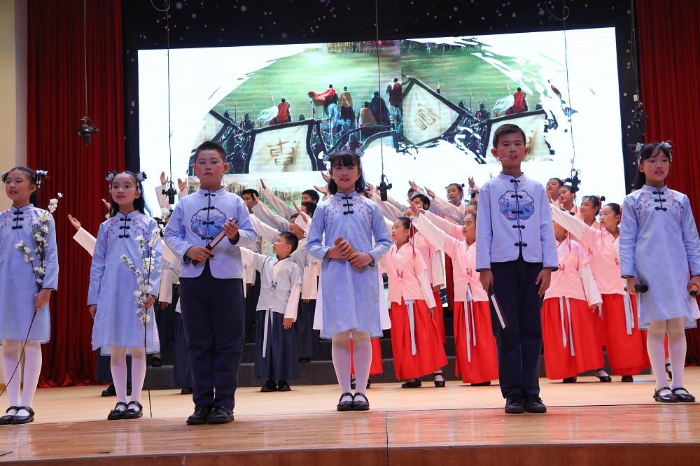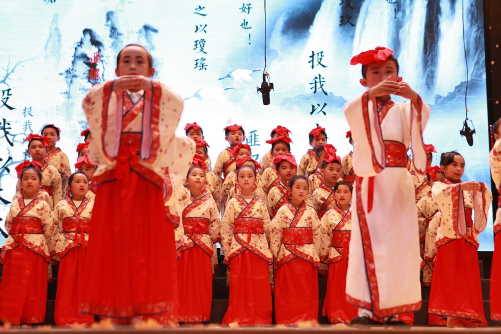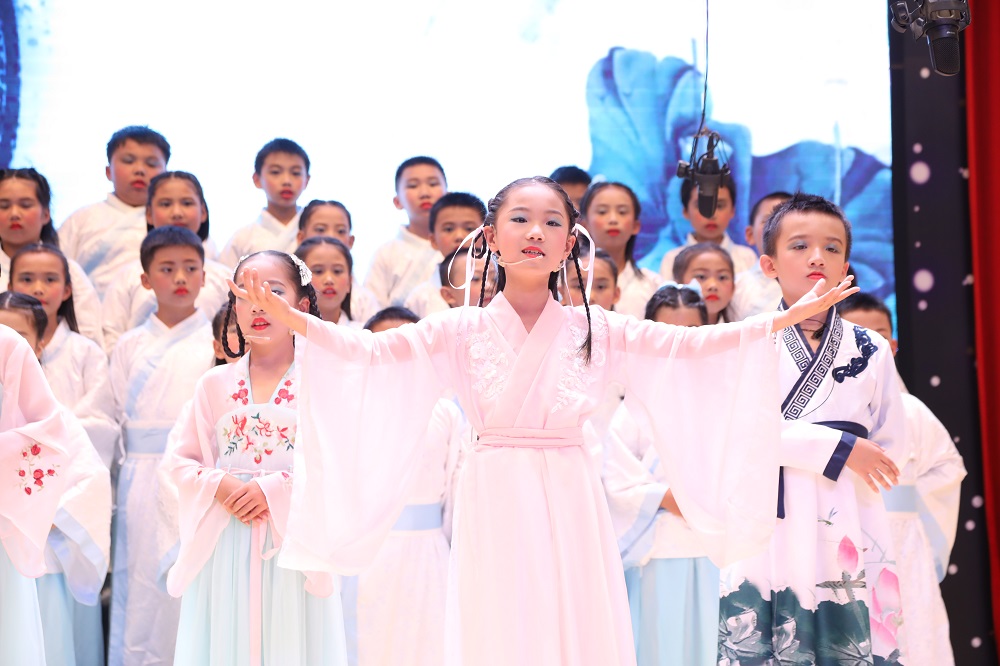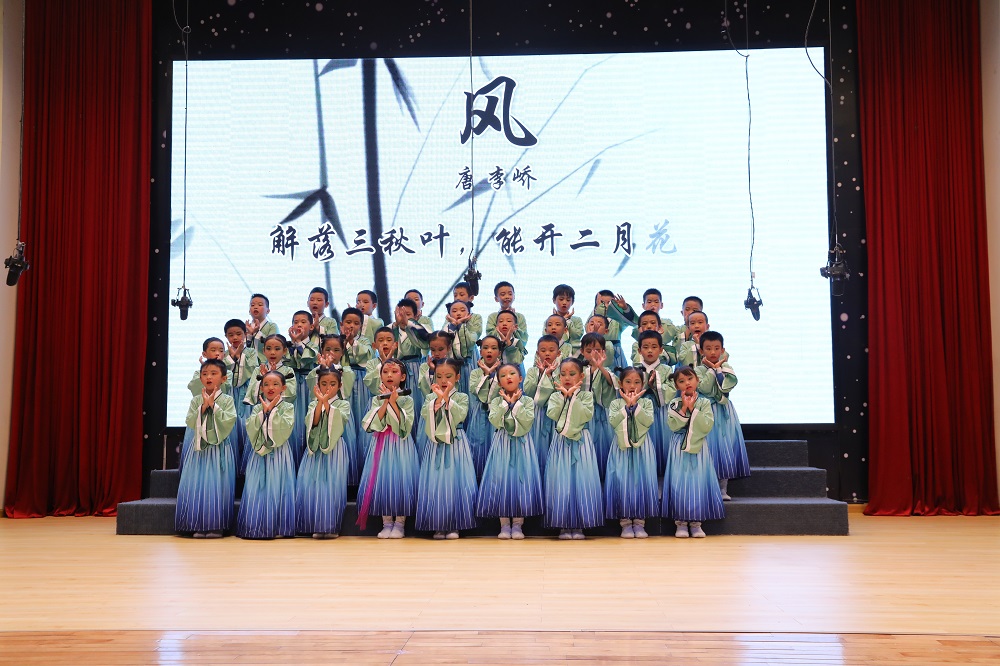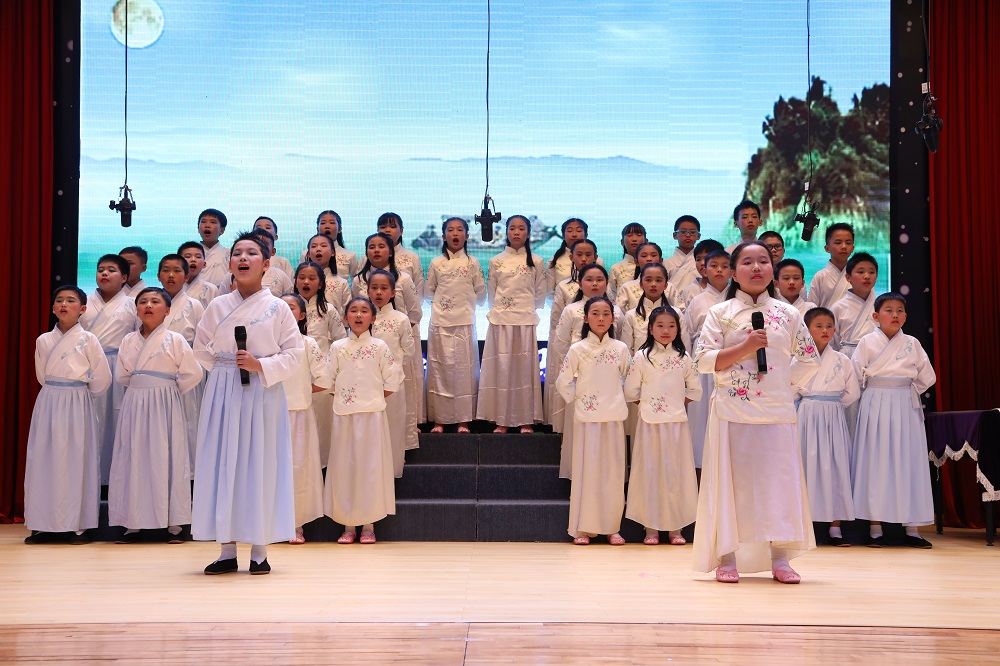 三年级学生们全身心投入,通过古诗吟诵、古诗新唱、集体诵读与音乐、舞蹈等相结合的形式,让表演活泼灵动,多角度演绎了中华经典国学,展示了中华经典美文的独特魅力和蓬勃朝气!诗的语言,典藏着五千年悠久的历史文化;诗的声音,演绎着不朽历史的风骨铿锵。诵读经典,让阅读成为习惯,使书香飘溢校园;感悟经典,将传统文化的种子播撒在我们的心田。