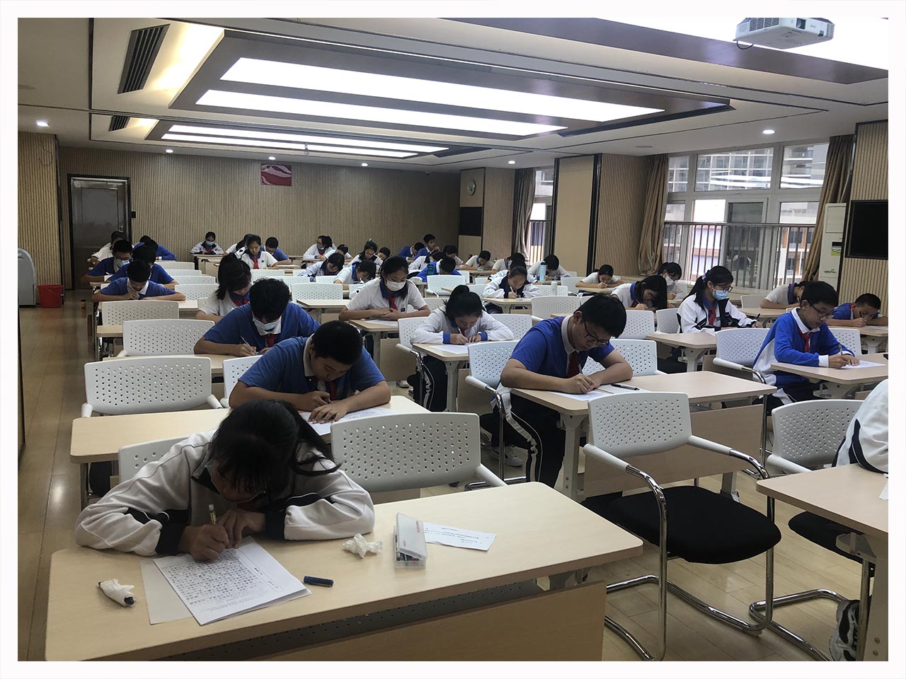 在初中语文组现场作文大赛现场,来自七、八年级的学生文思泉涌,妙笔生花。在初中英语组“英文手抄报”比赛中,同学们以巧妙的设计、精美的图式、整洁的英文书法展现了自己的英语素养。
