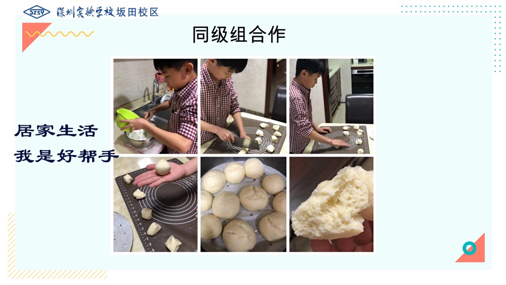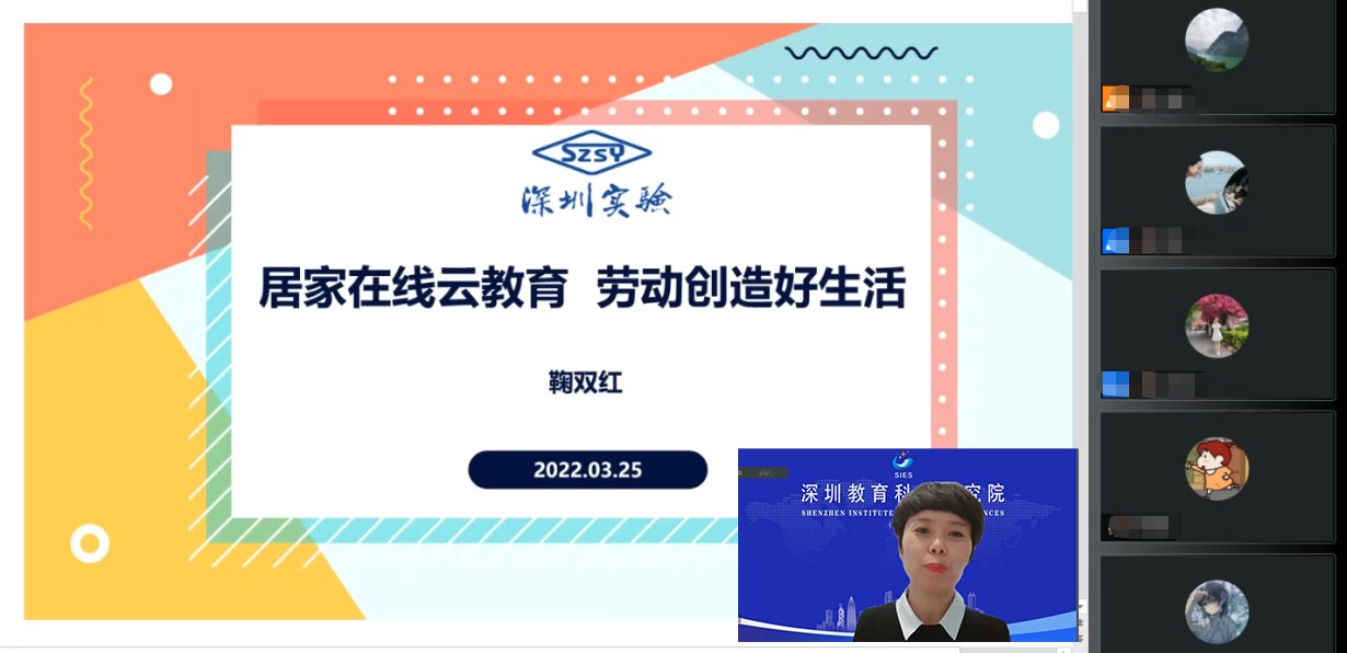 随后,小学部学生处副主任鞠双红以《居家在线云教育 劳动创造好生活》为主题进行了经验分享。坂田校区小学部早在深圳市文件规定之前,各年级就每周开设了一节劳动教育课,由班主任兼职任教,级组协作备课,各年级开展了许多实实在在的主题式劳动项目。在线教学期间,学校坚持将劳动教育和道德法治、体育、音乐、美术一样纳入在线课表,各年级又紧紧围绕“居家劳动”主题开展活动,定期举行劳动类表彰,学生受益,家长满意。鞠主任在交流中展示的在线教学期间许多学生居家劳动的场景和作品,让在线观课的老师纷纷留言赞叹“这样丰富的课程好有趣!”“我也想这样上一节……”市教科院劳动教研员韩青老师听后评价的第一感叹就是“实验的孩子真幸福!”