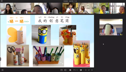 首先,青年教师邱旭君老师在Classin平台为大家带来一节《巧手改造 变废为宝》的现场直播课。本课结合三年级学生的年龄特点,教师重点教会孩子们用“缠绕”的方法将纸杯变形,引导学生观察、操作、思维、想象,用自己的智慧“变废为宝”,发现美,创造美,进而增强学生对中国传统文化技艺的热爱,培养劳动精神,体验劳动价值。课堂上,邱老师从容亲和,语言简洁,富有启发性。在邱老师的引导下,学生用灵巧的小手,有的把纸杯变成了向日葵,有的变成了花篮和彩帽,要献给抗疫一线的医生;还有的做成了飞机降落伞,要去搭救失事的MU5735航班上的人……