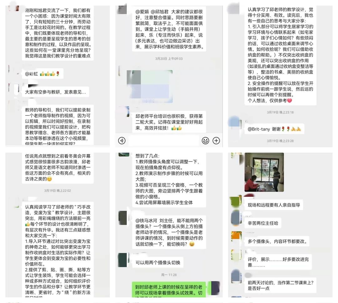 五天前,市教科院推荐坂田校区承担深圳市小学劳动教育“名师在线”公开课活动后,虽然时间紧,在线展示难度大,但我们仍然有底气,有信心,主动承担了教科院下达的第一期任务。行政、年级主任合议确定人选后,迅速组建了以冯校长挂帅指导、吴立新部主任全程筹划、三处室和年级主任及美术学科主任参与、由行爱娟老师领衔的技术和教练团队。大家连续几天马不停蹄,全力以赴,不管是课题的选择、教案的设计、在线磨课,还是材料的准备、平台的熟练、学生的组织,团队齐心协力,分工合作,精益求精,共同推送了一节精彩纷呈的在线课和一场有分量有内涵的经验分享。