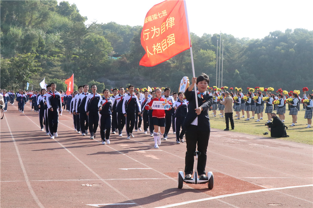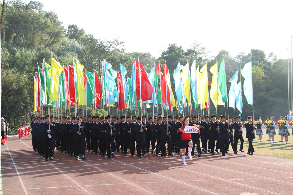 庄严肃穆的国旗队、校旗队、会徽队、花队方阵、各班级方阵、平均年龄28岁的青年教师裁判员方阵、九年级彩旗队,精神抖擞、活力四射,激情飞扬,依次走过主席台,接受全校师生的检阅。