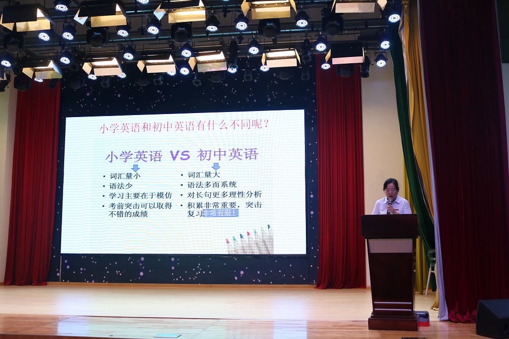 谷琰老师将小学英语和初中英语进行了比较,指出初中英语具有词汇量大、语法多而系统、需更多理性分析等特点。她从“输入”和“输出”两个方面解构英语学习,认为在“输入”方面同学们应做好“听”和“读”,在“输出”方面要做好“说”和“写”。最后她以“Well begun is half done!”(好的开始是成功的一半)勉励七年级新生。