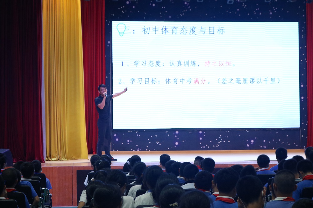 陈明华老师以精彩的现场表演为开场,引导七年级同学们关注初中体育规范。随后,他从“小学与初中体育的差异”“初中体育中考特点”“初中体育态度与目标”“初中体育项目分类”“体能类学法指导”“技能类学法指导”等多个方面为同学们进行了细致的解说,他勉励同学们坚持运动,并科学运动,不仅锻炼出健康体魄,受益终身,还能为体育中考助力。