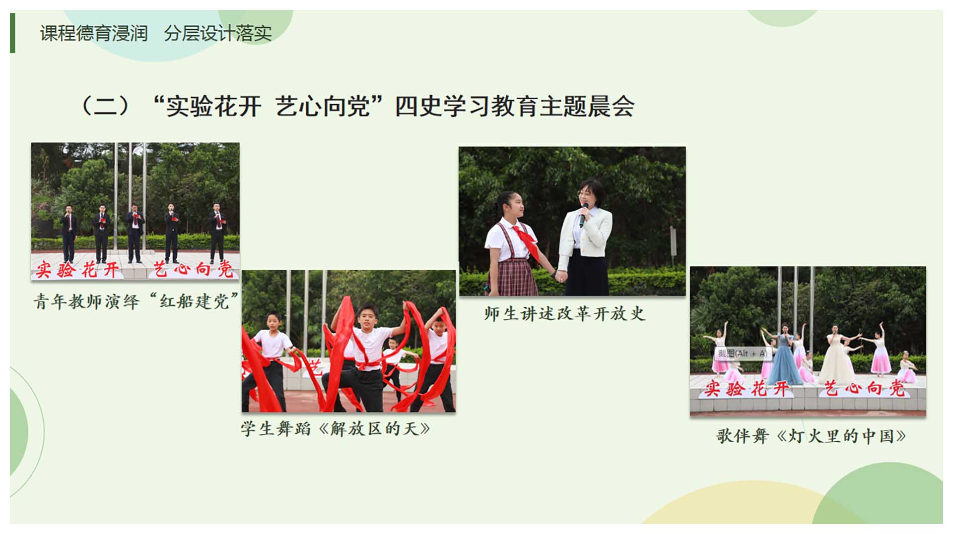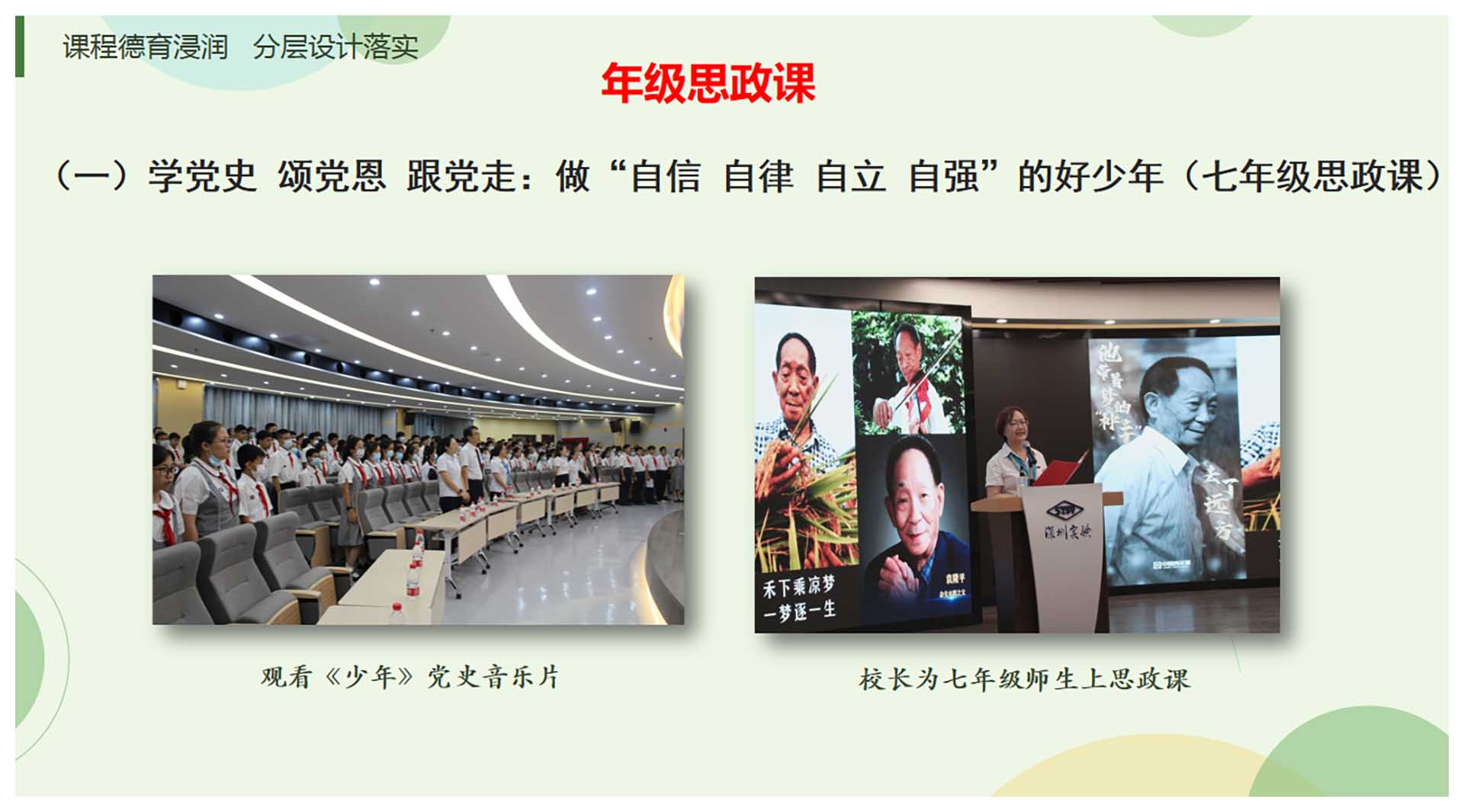 本次校长创新思政课案例是学校德育工作的一个系列,从立德树人根本任务出发,结合建党一百周年以及实验学校厚实的文化基础和坂田校区“改薄增质”的实践经验,以课程德育浸润、分层设计落实,通过校长思政课、年级思政课开展一系列有设计、有创新、有分层、有温度、有高度的主题课程。