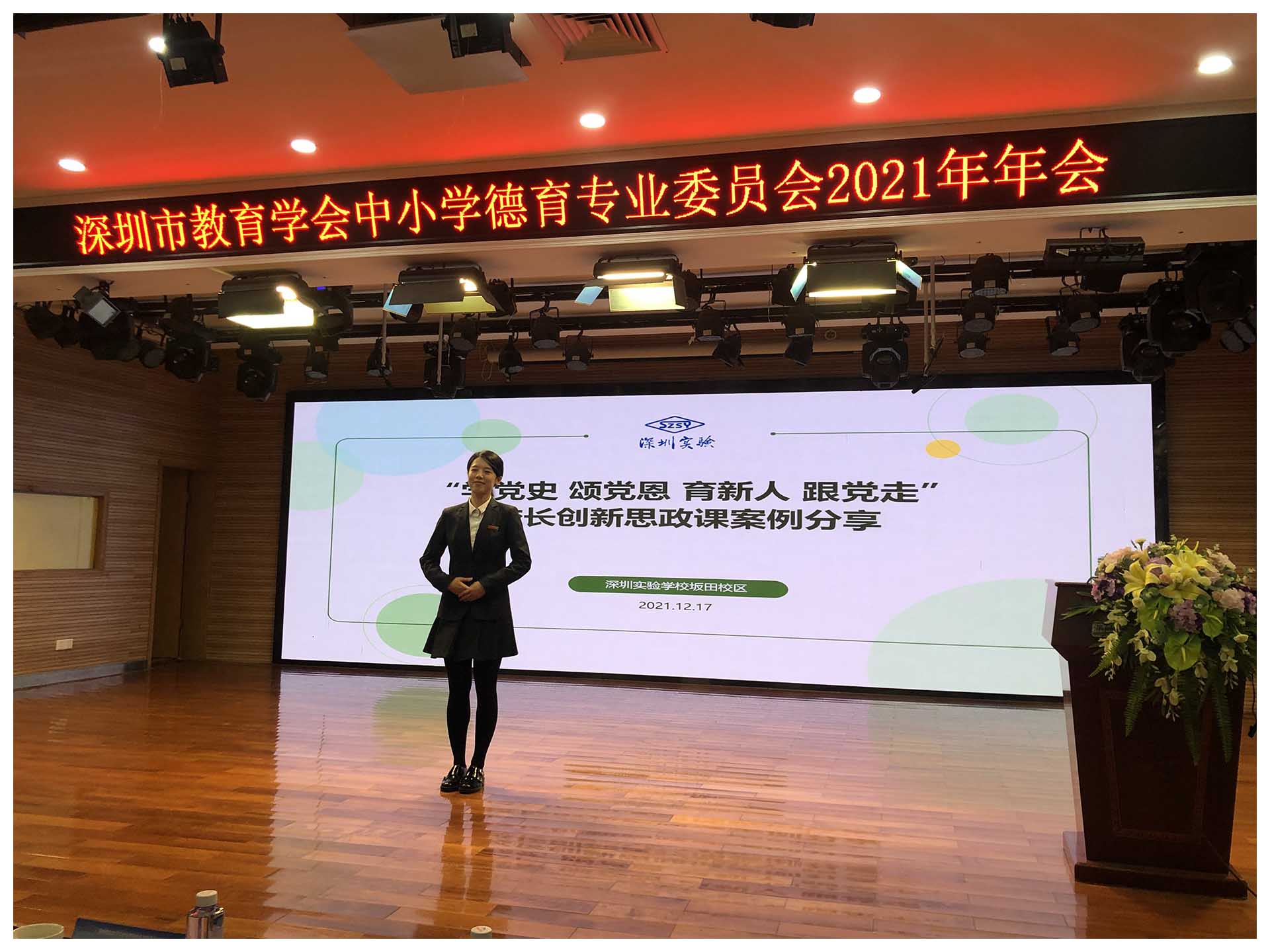 学党史、颂党恩、育新人、跟党走。12月17日下午,在深圳市教育学会中小学德育专业委员会2021年年会上,坂田校区小学部学生处冯晓敏副主任代表校区,作了“学党史 颂党恩 育新人 跟党走”校长创新思政课案例分享。