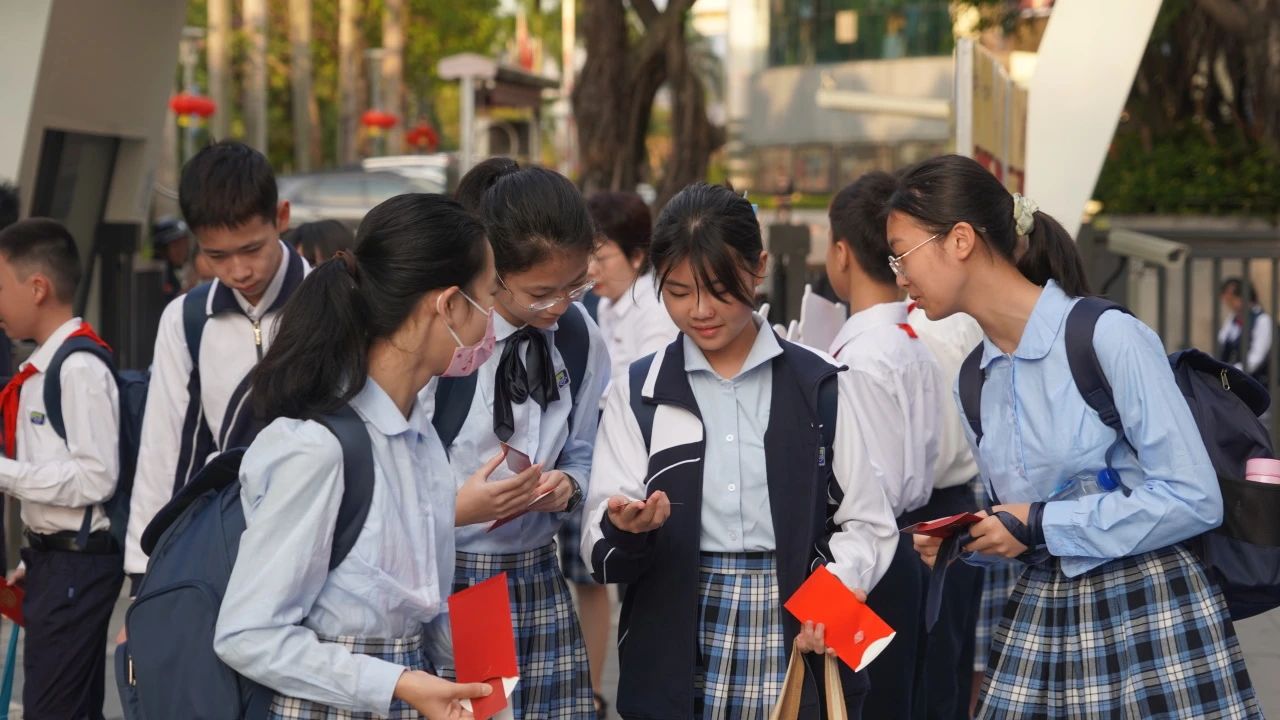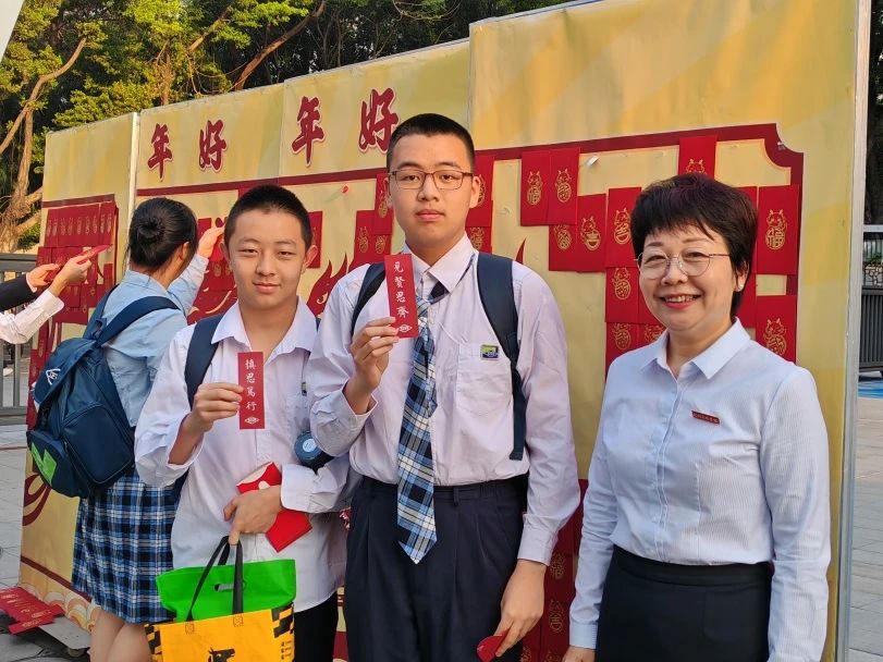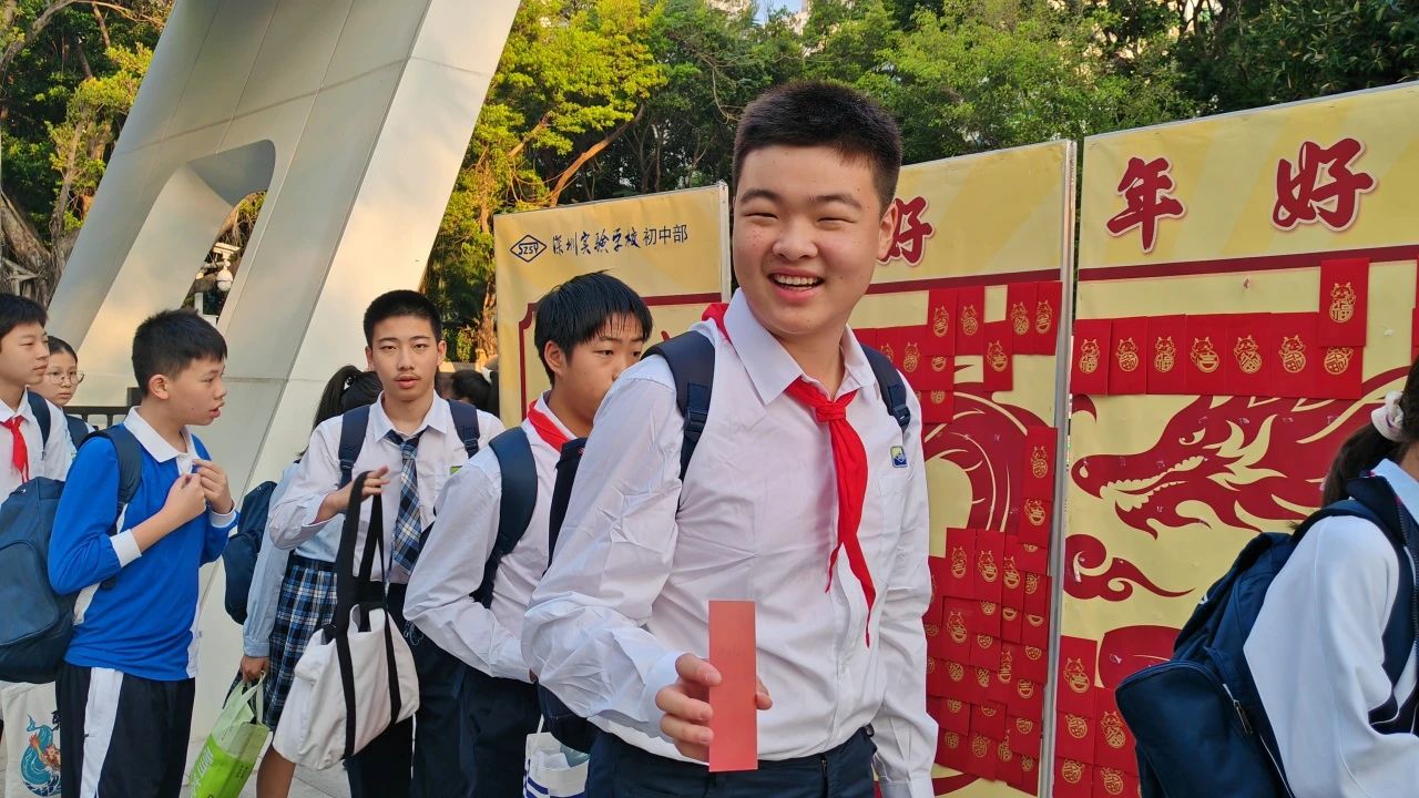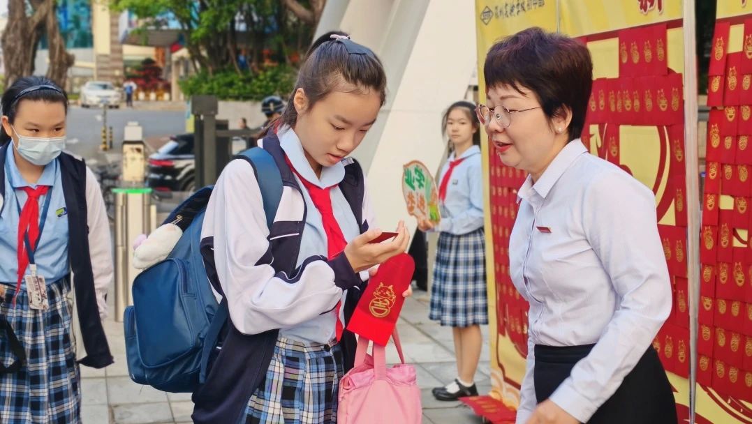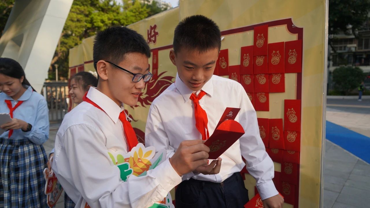 同学们惊喜地发现校门口摆放着巨幅红包墙,兴奋地抢起红包来。他们拆开红包,里面是一张精心设计的卡片,上面有校长、老师们亲笔签名的祝福语。