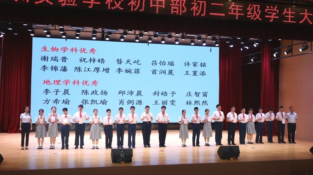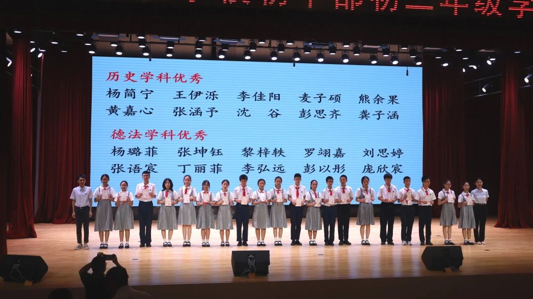 大会最后一项是激动人心的颁奖时刻。经过一年的不懈努力,初二年级涌现出了一大批在学科学习和班级管理上表现突出的同学,教务处邰士剑主任和彭伟琼主任为学业优秀生和优秀班干部颁奖。