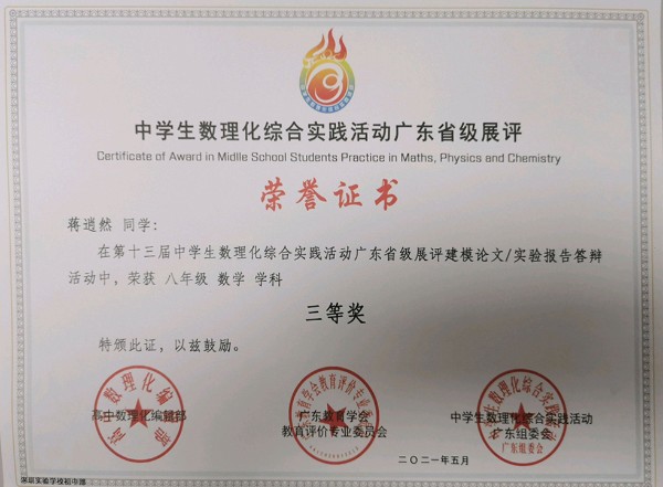 在数学学科主任张岭老师的带领和支持下,韩文芳、秦哲、胡君嫦、陈少刚、王清超五位老师指导初二年级黄屹、沈月盈、屈舒杨、蒋逍然、李谦坤和曾子轩六位同学加了本次综合实践活动,并获得优异成绩。