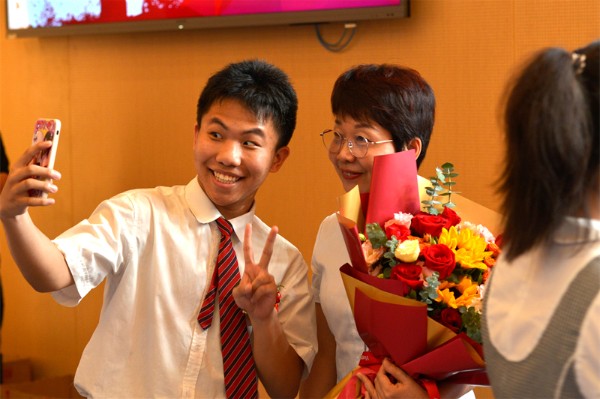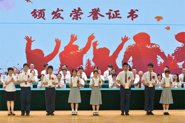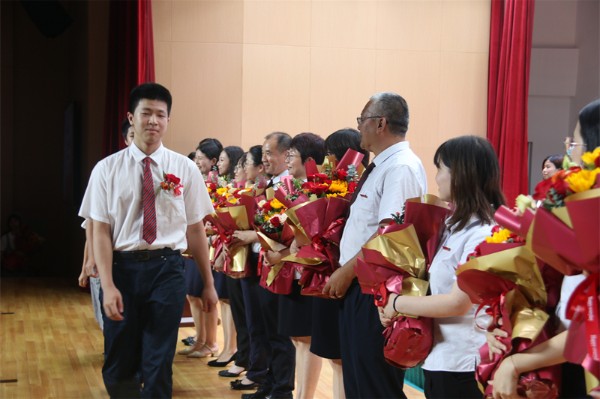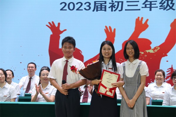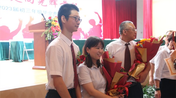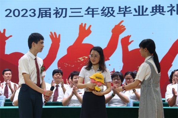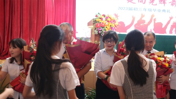 伴随着欢快明朗的深圳实验学校校歌,2023届初三年级毕业典礼落下帷幕。全体初三年级毕业生、家长们纷纷走上舞台,向老师们献上鲜花,并与每一位老师握手拥抱,彼此互道珍重。