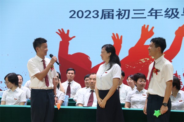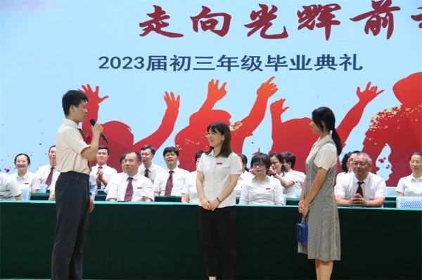 教务处王洪吉主任宣读了2023届毕业生准予毕业的决定,并代表学校对圆满完成初中学业的286名毕业生表示热烈的祝贺。王主任也向三年来为同学们的成长倾注了无数心血和智慧的老师们致以深深的敬意和诚挚的感谢。