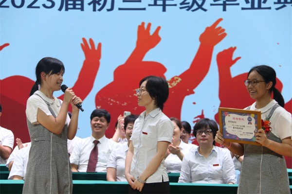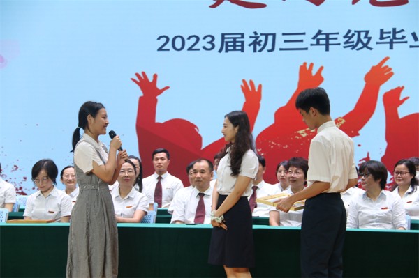 随后,学生家长代表廖颖慧女士发表致辞。她衷心感谢学校和老师们对孩子们的关怀和教育,对孩子们的成长和进步感到无比自豪。她鼓励所有初三毕业生要珍惜所受的教育,不畏困难,坚定信心,勇敢地面对未来的挑战,书写出属于自己的精彩人生!