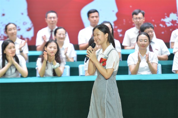 教师代表徐路泳老师带来了题目为《人生是旷野,不是轨道》的感言,她首先回顾了三年来师生一起度过的美好时光,表达了对同学们的不舍和祝福。她向同学们提出了三点期许:一要保持终身学习的能力,二要保持创造力,三要保持共情力,立己达人,善待别人,成就他人,贡献社会,这才是对实验校训“励精图治”最好的实践和证明!