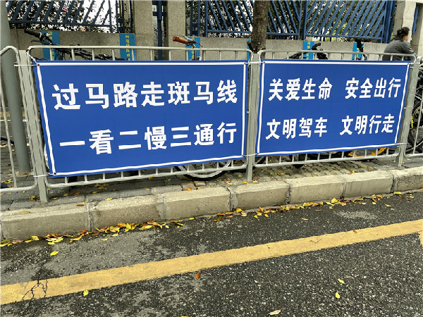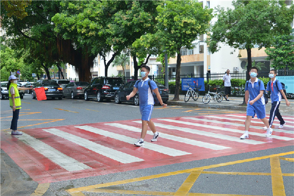 家长护航保平安。为保障学生交通安全,初中部热心家长以班级为单位组成护航队,每天清晨准时来到校园门口的斑马线两侧,提醒来往车辆避让学生、保障学生安全进入校园。