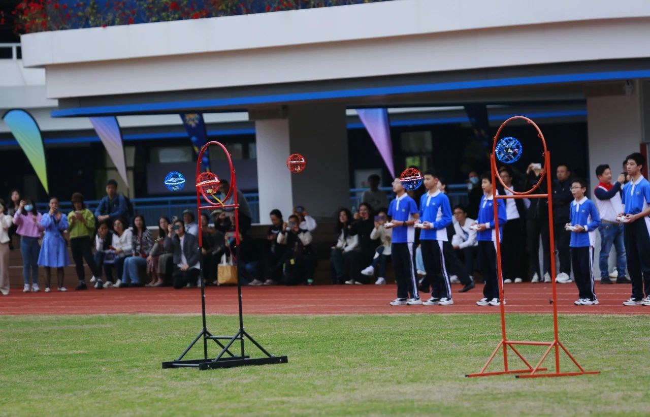 初中部航模队同学上场后,娴熟操控着足球无人机,流畅穿过球门,在操场上空自由飞行,引得现场的同学们欢呼喝采。