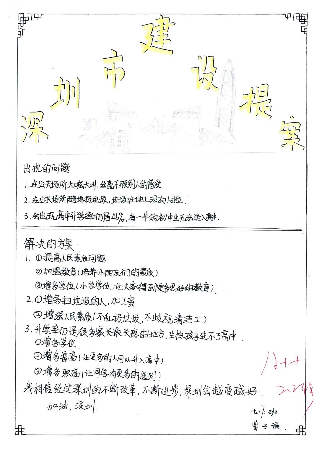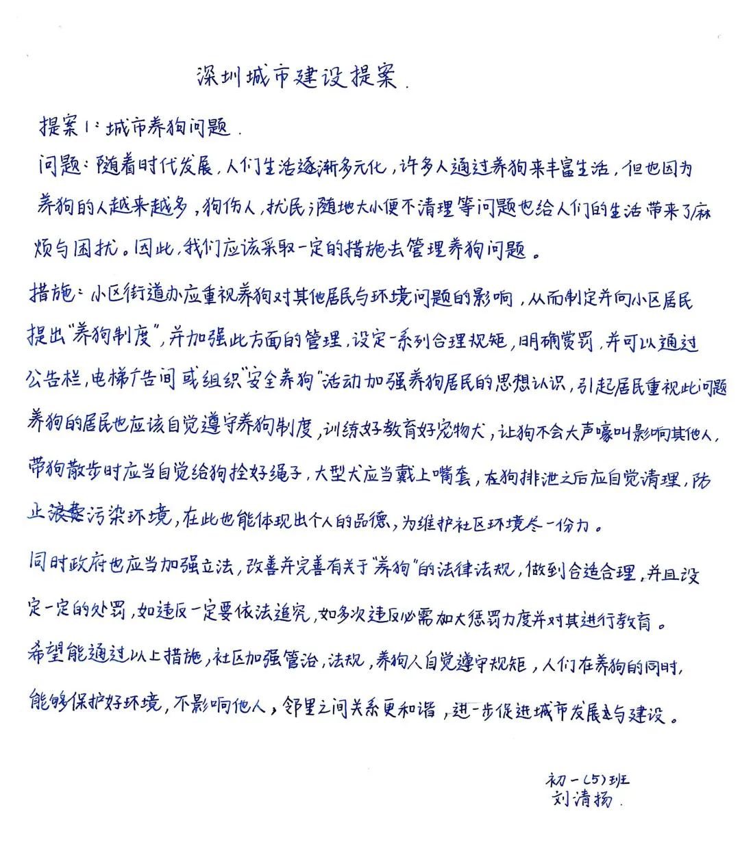 第二个作业是深圳城市建设提案。深圳是我们出生和成长的城市,她热情、美丽、开放、包容、生机勃勃。我们在深圳茁壮成长,对她的爱也越来越深。我们认为建设提案可以从以下几个方面进行提升:增加一些青少年科普基地,增长见识,培养更多的科技人才;多建设一些中小学学校,现在的学校学生人数太多了,不利于素质教育和个性化教育;增加更多的城市绿道和公园,让大家更多的运动起来……我知道,建设一个城市需要很多各个方面的人才,需要设计者,也需要建设者,希望未来我们也能为深圳的发展贡献自己的力量!