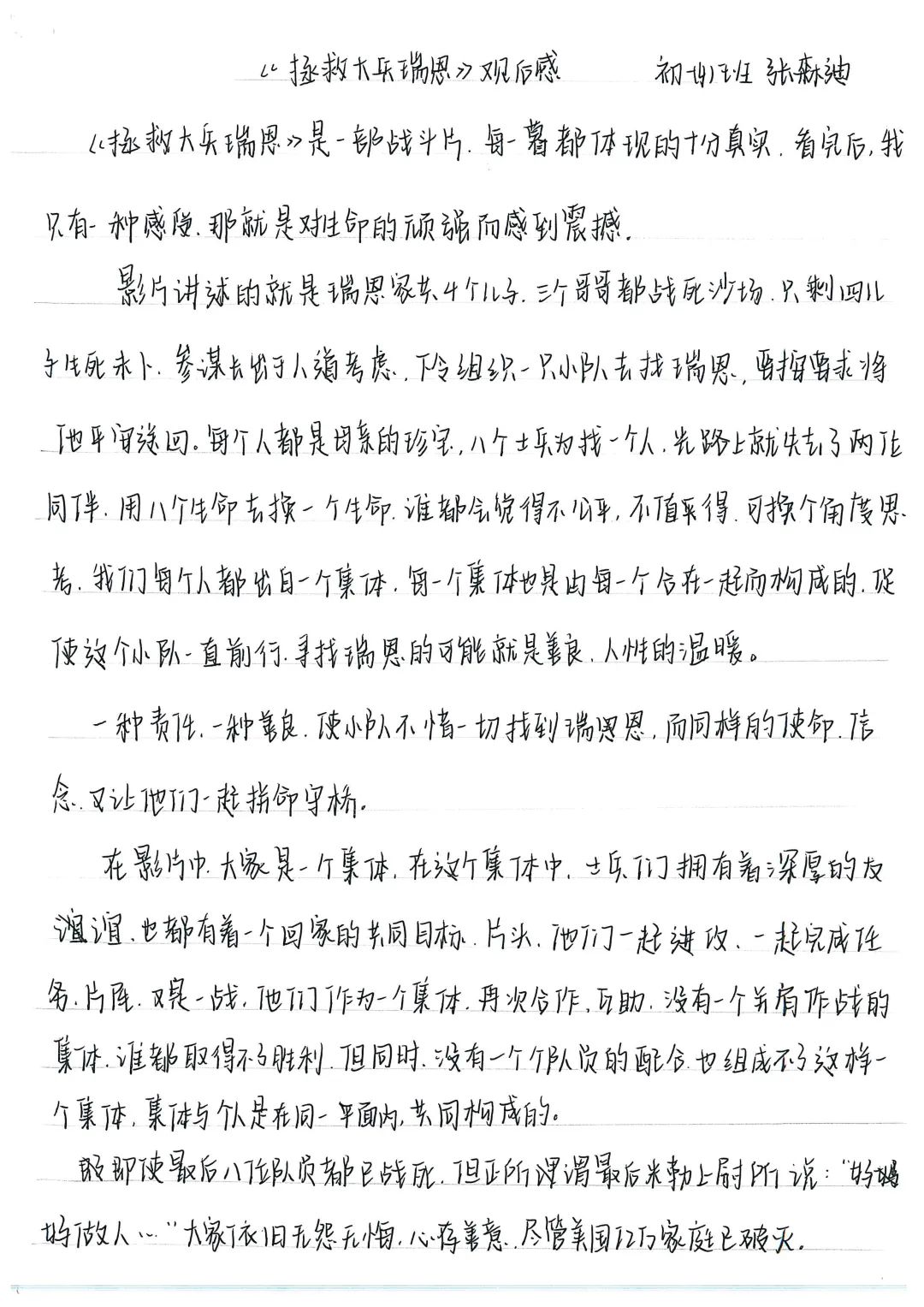 寒假期间我们还看了电影《拯救大兵瑞恩》。刚开始我很不理解为什么要兴师动众牺牲大家去找一个不知生死也并不是有重要职务的大兵,后来我认真思考了故事的背景和瑞恩几个哥哥都已经牺牲的事实,明白了拯救瑞恩能给后方的妈妈巨大安慰,能给后方的家人们,给所有士兵的父老乡亲安慰,安抚他们的心,让他们感到温暖,感觉在国家心里他们还是很重要的。这对于巩固后方的稳定非常重要,也能保证军队能有源源不断的新生力量,这样才能获得最后的胜利。这和我们红军八年抗战、三年解放战争能取得最后的胜利是一样的道理:人民的拥护才是战争能够取得胜利的关键。