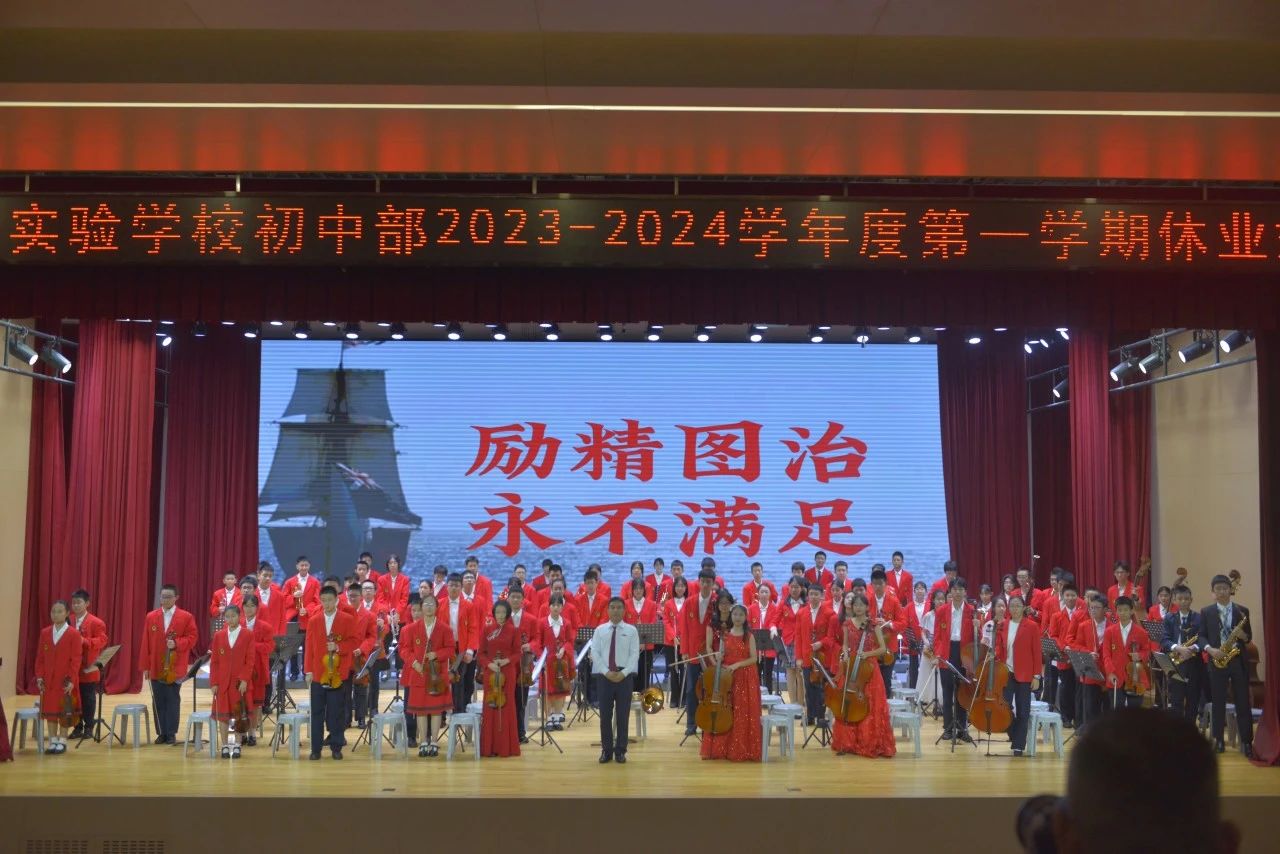 1月19日上午9:00,深圳实验学校初中部于报告厅召开本学期休业式,全体师生到场参会。开场环节中,音乐学科杨文政老师带领初中部学生交响乐团演奏了肖斯塔科维奇《第二圆舞曲》与《加勒比海盗》主题曲。