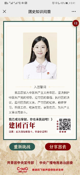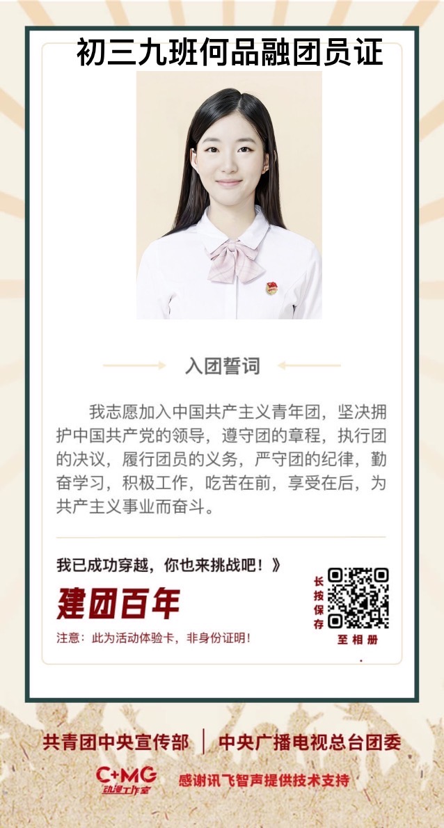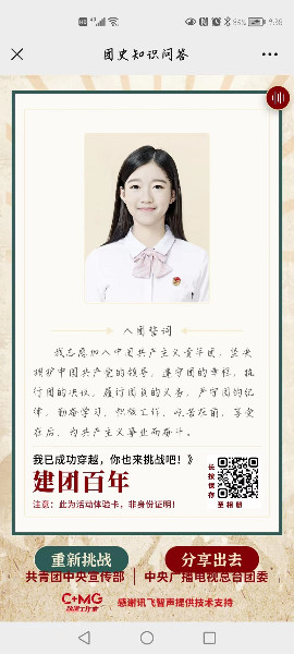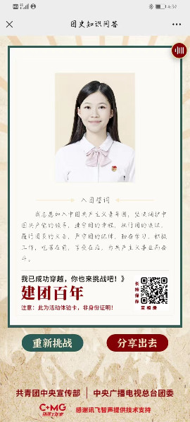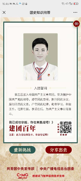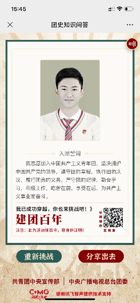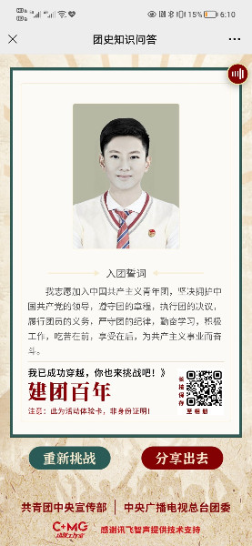 5月8日,共青团中央推出团史答题互动、赢取专属电子团员证的活动,初中部团委号召全校共青团员参加,为自己的青春岁月留下美好回忆。
