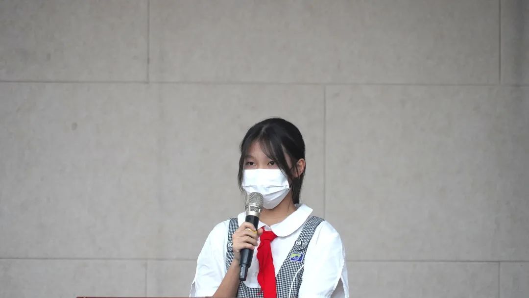 初二(2)班孙淑窈同学代表初中部大队委员会宣布超龄离队人数。