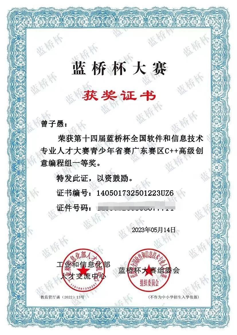在第十四届蓝桥杯青少年编程大赛全国总决赛中,有三位选手分获全国一等奖和三等奖的优异成绩。他们先前均获广东省选拔赛一等奖,作为广东省代表选手参与了全国总决赛的角逐。具体获奖名单如下: