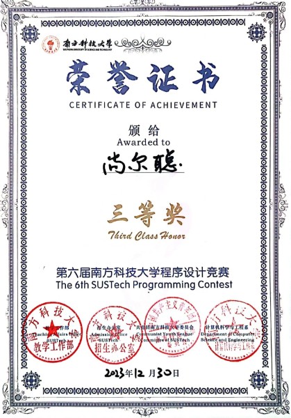 12月30日第六届南方科技大学程序设计竞赛拉开帷幕,来自南科大、深大、深科技大以及部分中学的优秀信奥选手齐聚一堂。面对近400位计算机专业大学生选手,初中部信奥队尚尔聪、靳宝涵同学不畏挑战,脱颖而出,分别拿下三等奖和排名赛172的好成绩。