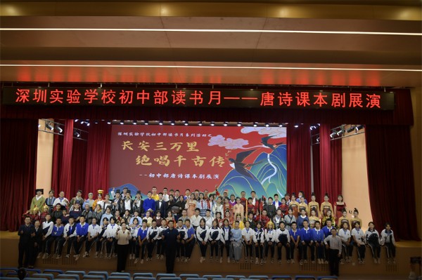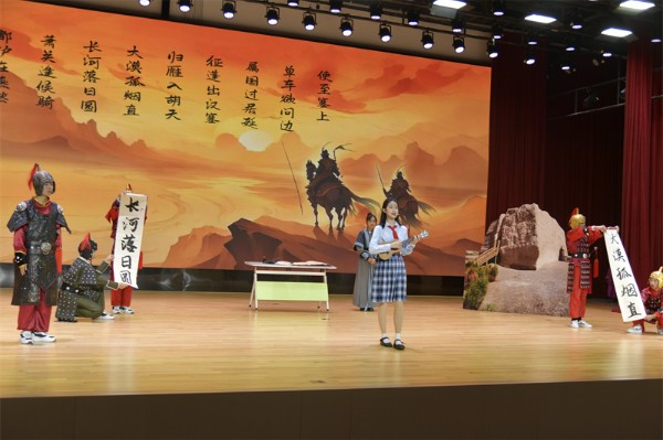 作为初中部一项传统活动,本次展演选取唐诗为主题,初二年级的五个班组,把一首首语文课本中的经典唐诗搬上舞台,讲述五位不同时期诗人的历史故事,回放唐朝的兴衰荣辱。在溯源诗词创作背景、体验诗人创作心境的过程中,五个班组的表演者与初二年级全体老师、同学,都深深地为诗人们的家国情怀所动容,直观地感受和品味到中华传统文化之美。