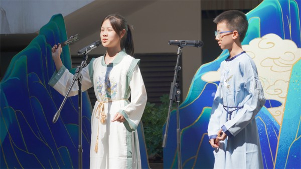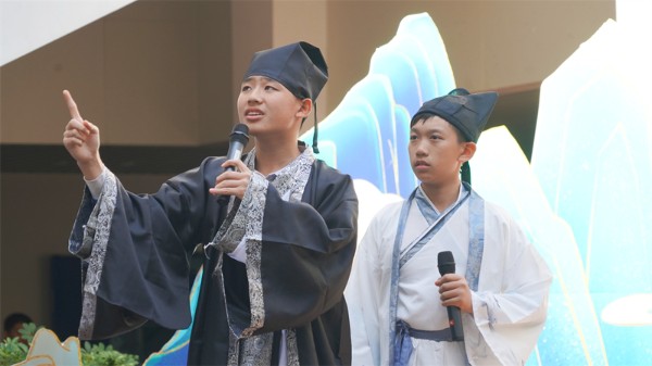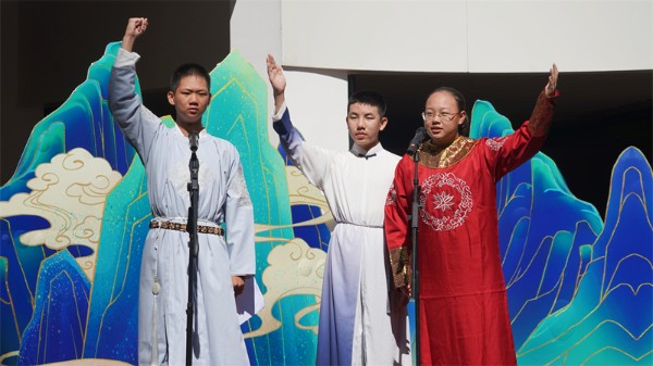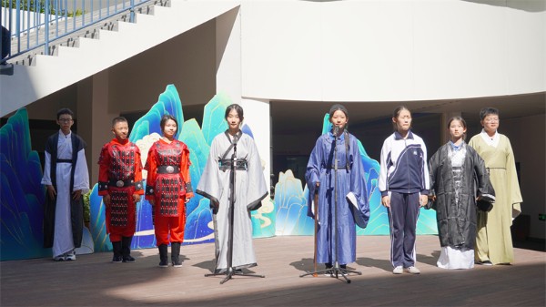 值得一提的是,课本剧演出前两天,各班演员在学生食堂边的露天舞台进行预热宣传,吟诵诗词,各显神通,场面活泼热闹,为正式的演出蓄势。
