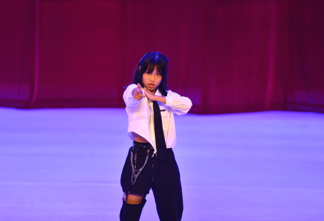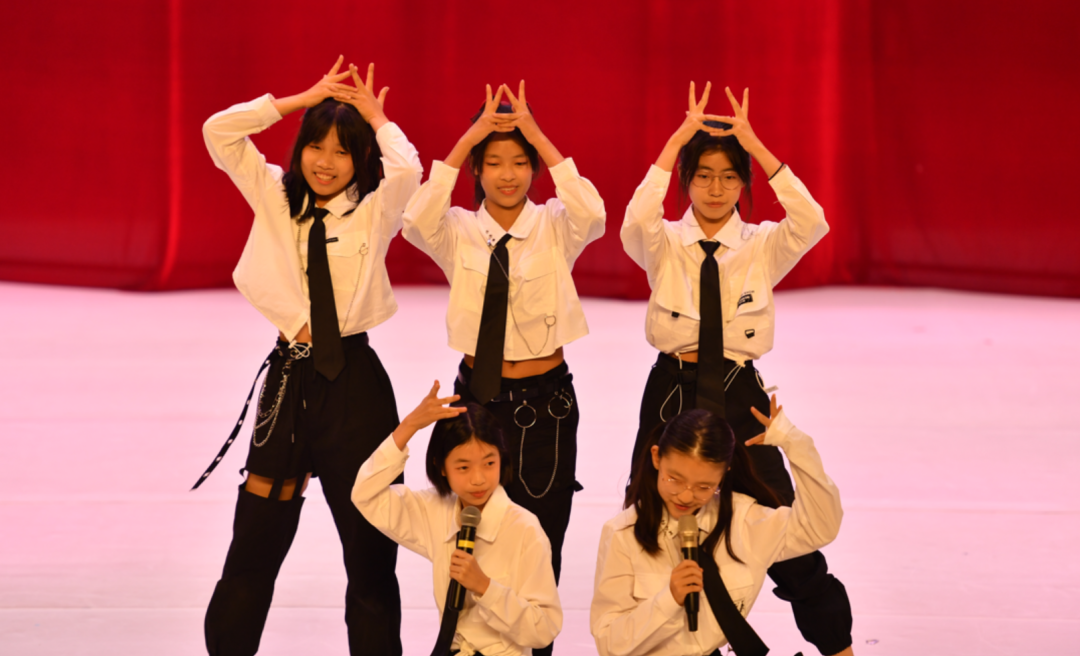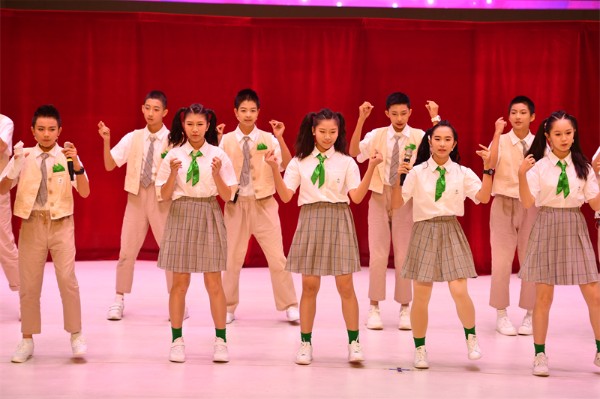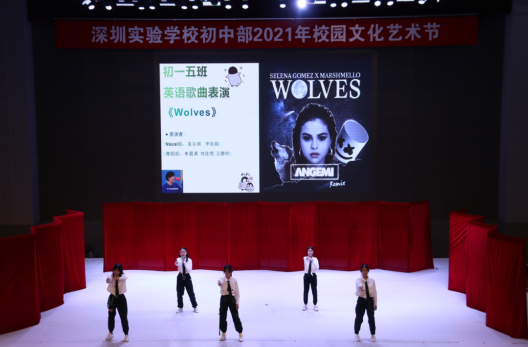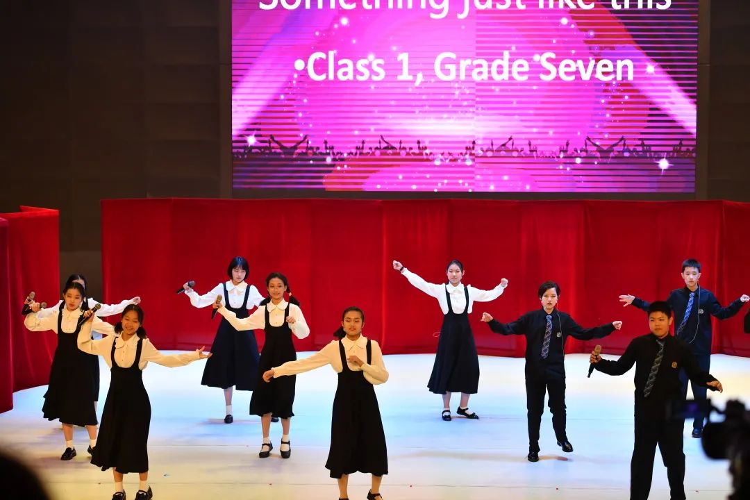 初一(2)班热歌劲舞Attention;初一(1)班和声悦耳的something just like this;初一(5)班则带来热情洋溢的Wolves,强有力的节奏感和精心编排的舞蹈瞬间吸引住观众。