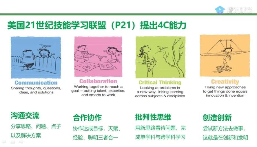 ◇ 美国21世纪学习联盟确定的“4C”能力:沟通能力、合作协作、批判性思维能力和创造
