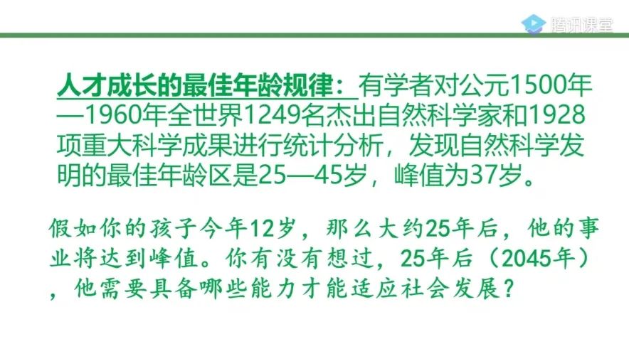 在“关注生涯规划,培养孩子面向未来的关键能力”专题中,陈老师引用了两本著名的家庭教育书籍《人生设计在童年》和《全新思维:决胜未来等6大能力》中提到的经典理论,向家长们介绍了对未来发展产生积极影响的几项能力,比如: