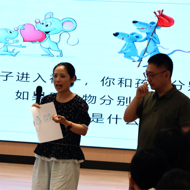 乐老师用游戏“孩子说”进行开场热身,家长们迅速进入状态,并通过心理绘画“看见”孩子初一入学后的情绪状态和适应问题:活跃的猴子、安静的兔子、慢腾腾的乌龟、开心的熊猫……