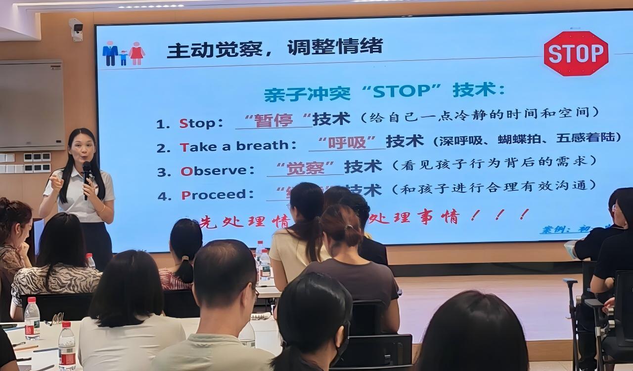 当“学习”并不是亲子沟通的最佳话题时,乐老师建议家长要从孩子感兴趣的内容着手,认真聆听孩子对初中生活的分享且不评价不建议,并通过现场情景模拟练习提升家长的亲子沟通技巧:多用“我信息”,少用“你信息”,和孩子出现冲突时可以尝试用“STOP”技术与孩子进行合理有效的沟通,在孩子需要的时候提供情感支持。