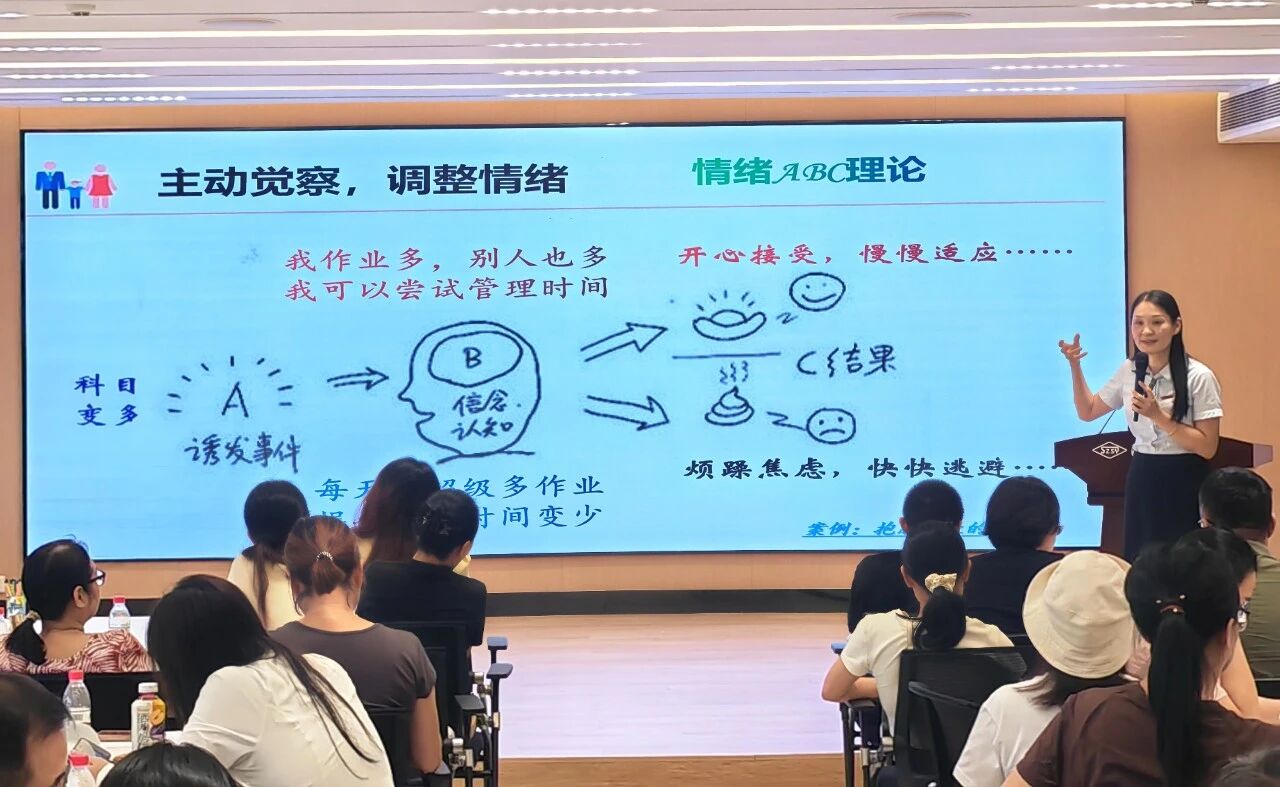 在小组头脑风暴的互动分享和心灵碰撞之后,乐老师和家长强调:当面对孩子的不良适应状况时要先处理情绪,再处理事情,可以通过情绪ABC理论理解孩子抱怨背后的无力感,学会看见并接纳孩子的情绪,共情孩子的感受。当孩子感觉到被理解与支持之后,才有可能去调整情绪与想法,从而做出行为改变。