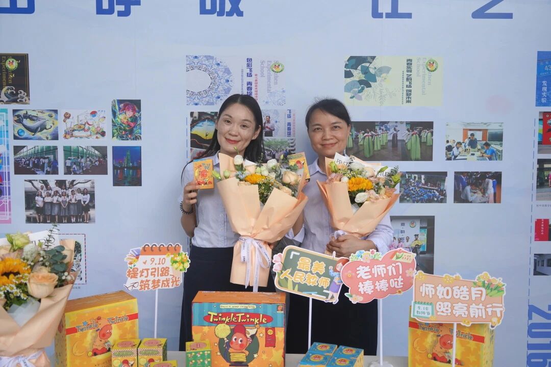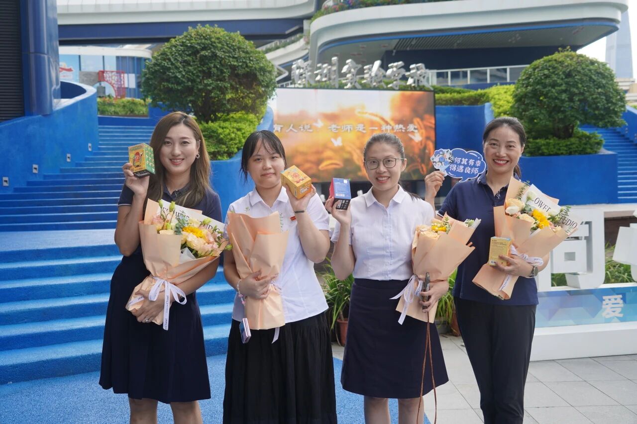 9月10日上午,学生代表手持鲜花守候于喷泉池边、办公室前,盼望着老师们的到来。师者如光,永远向阳。初中部选择象征着阳光与启迪的向日葵花束,寓意老师用知识和智慧照亮学生人生道路,给予学生温暖和力量。鲜花缀着晨露,花语饱含尊敬,递花时一句句“老师节日快乐”、“感谢您的启迪”,师生温情成校园佳景。