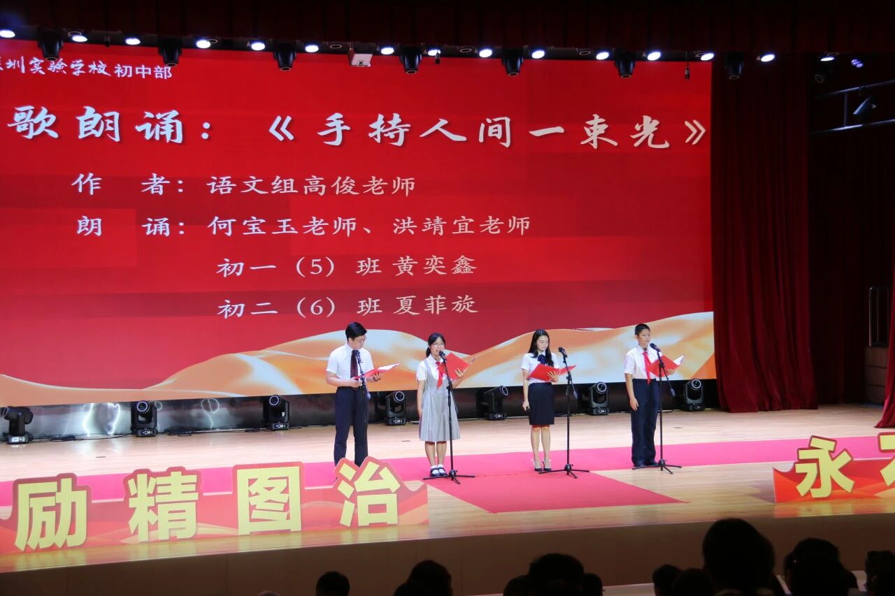 9月9日上午,初中部全体师生欢聚小礼堂,2025年教师节庆祝大会在此拉开帷幕。语文组高俊老师执笔,结合初中部师生的日常点滴,精心创作诗歌《手持人间一束光》,字里行间满是 “实验人” 的温情与坚守。何宝玉老师、洪靖宜老师与两名学生代表一同走上舞台,深情演绎诗歌 。师泽像烛,微光引航;师德若泉,滋养无形 。