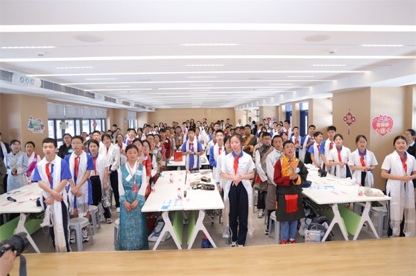 藏族学生身着盛装跳起欢快舞蹈。全体师生齐唱《爱我中华》,用行动诠释“民族团结一家亲”的深刻内涵。