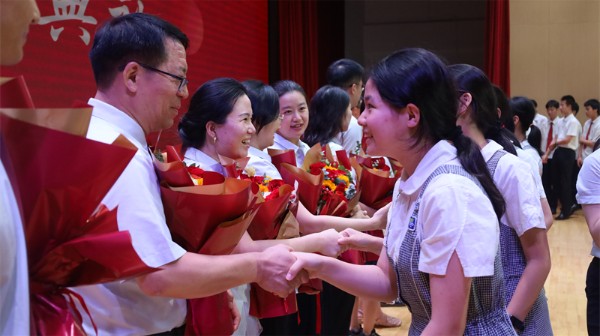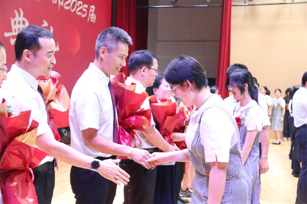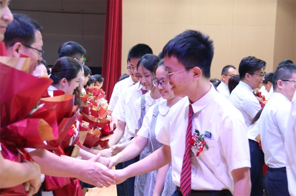 最后,在一曲《我是一颗实验的种子》的歌声中,全体初三教师登台接受优秀毕业生献花,并与全体初三学生握手道别,为三年时光画上了温情的句点!