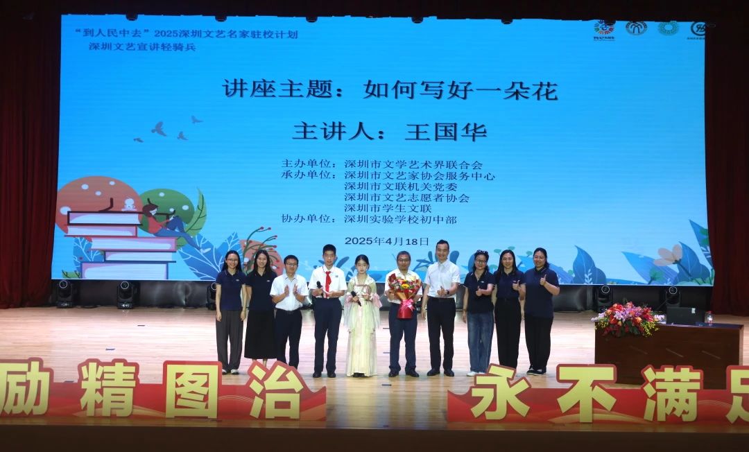 2025年4月18日下午4点,深圳实验学校初中部报告厅内座无虚席,我校特邀著名作家王国华老师,与同学们共育文化种子,书写文学教育的深圳故事。王老师以“如何写好一朵花”为主题,开展了一场精彩的讲座。初中部李笑梅执行校长,教务处邰士剑主任出席活动。