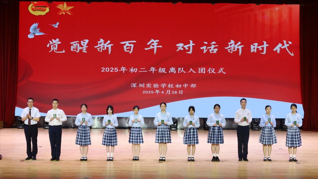 为深入学习贯彻习近平新时代中国特色社会主义思想,落实党的二十大及二十届二中、三中全会精神,深化党团队一体化育人体系,引领青少年厚植家国情怀、勇担强国使命,在“五四”青年节到来之际,初中部举行了离队入团仪式。党总支书记、执行校长李笑梅和各处室领导以及全体教师出席会议,初三共青团员、青年和初一年级少先队员全程观摩。