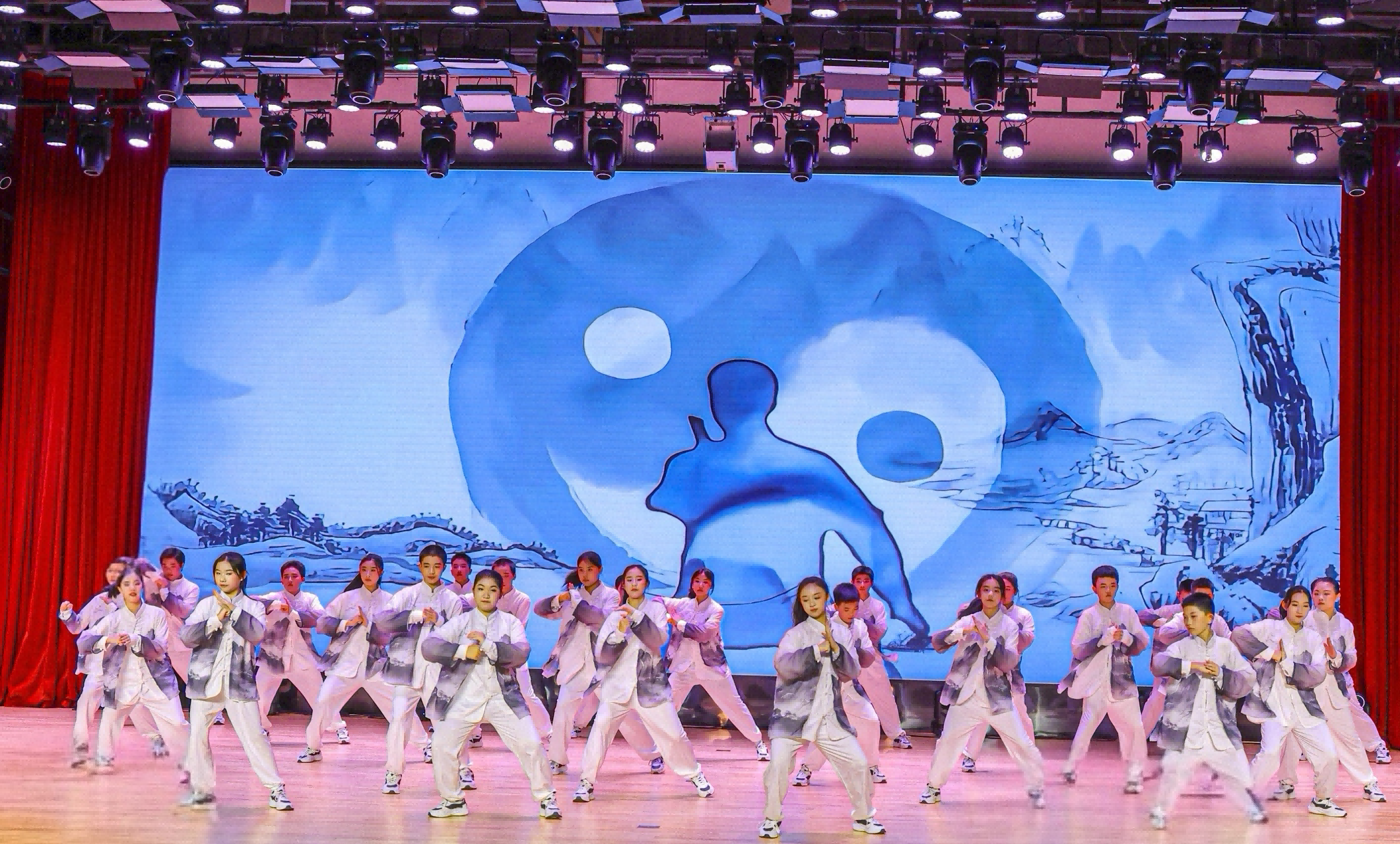 这是一个融合舞蹈与武术的表演,是传统文化与现代元素的结合。舞武少年破长空,刚柔并济展雄风。拳携身韵凌云志,热血激荡写苍穹。