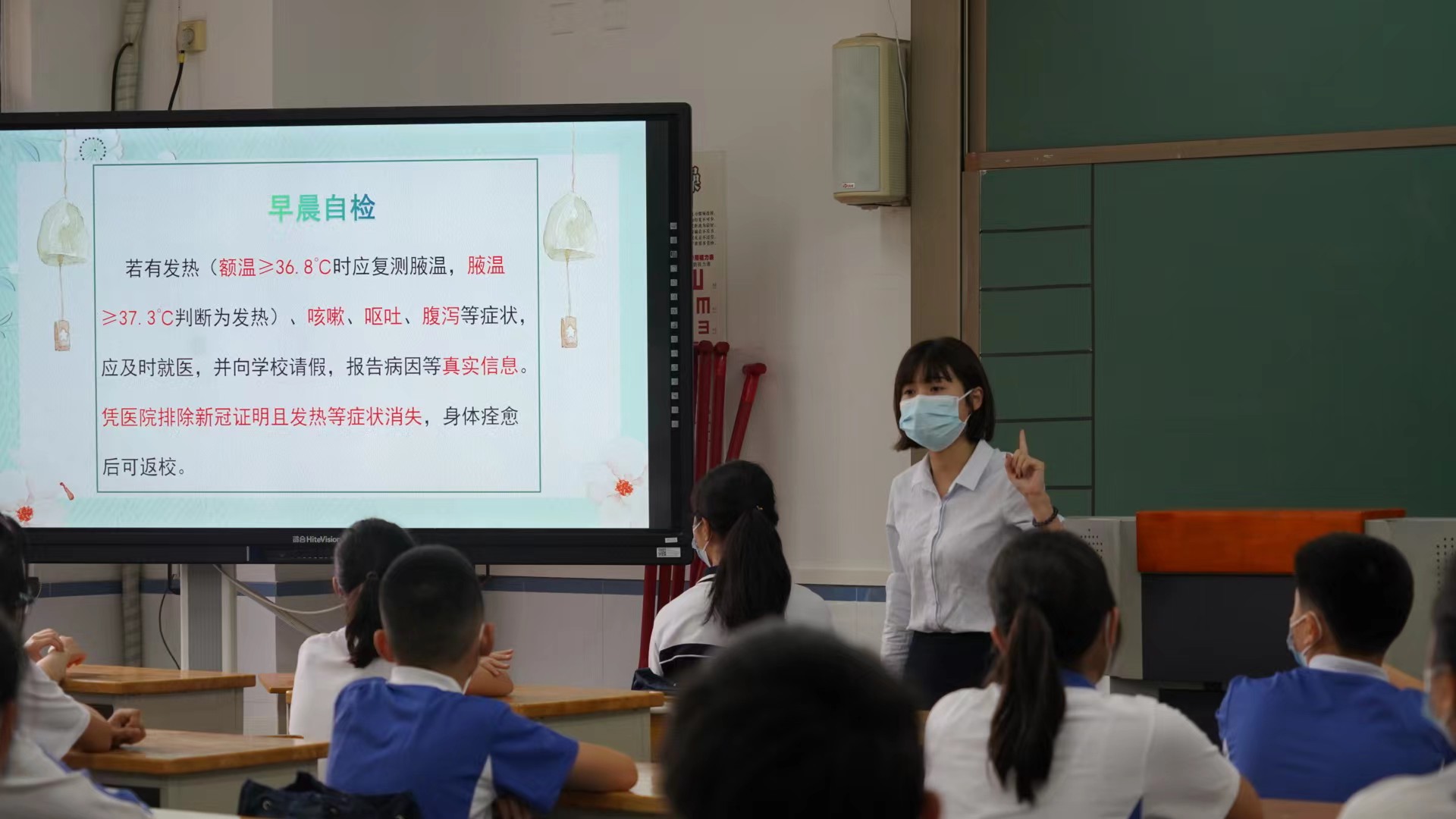 早上7点,按照开学前的礼仪值班部署,值班领导、教师和家长义工队员准时赶到学校,为学生们围起安全入校通道,测温组的老师在指定位置待命,为校园疫情防控架起第一道安全屏障。教室内,班主任老师早已打开门窗在等待同学们的到来。随着第一堂课的铃声响起,各班《风拂铃响笑脸归》开学防疫第一课准时开始。教师们利用精心准备的课件、视频并结合具体实例,就疫情防控、健康安全、心理疏导等方面帮助学生提高自我防控意识和防控能力,老师和同学们交流防疫知识、交流家国情怀、责任与担当,课堂氛围异常活跃。