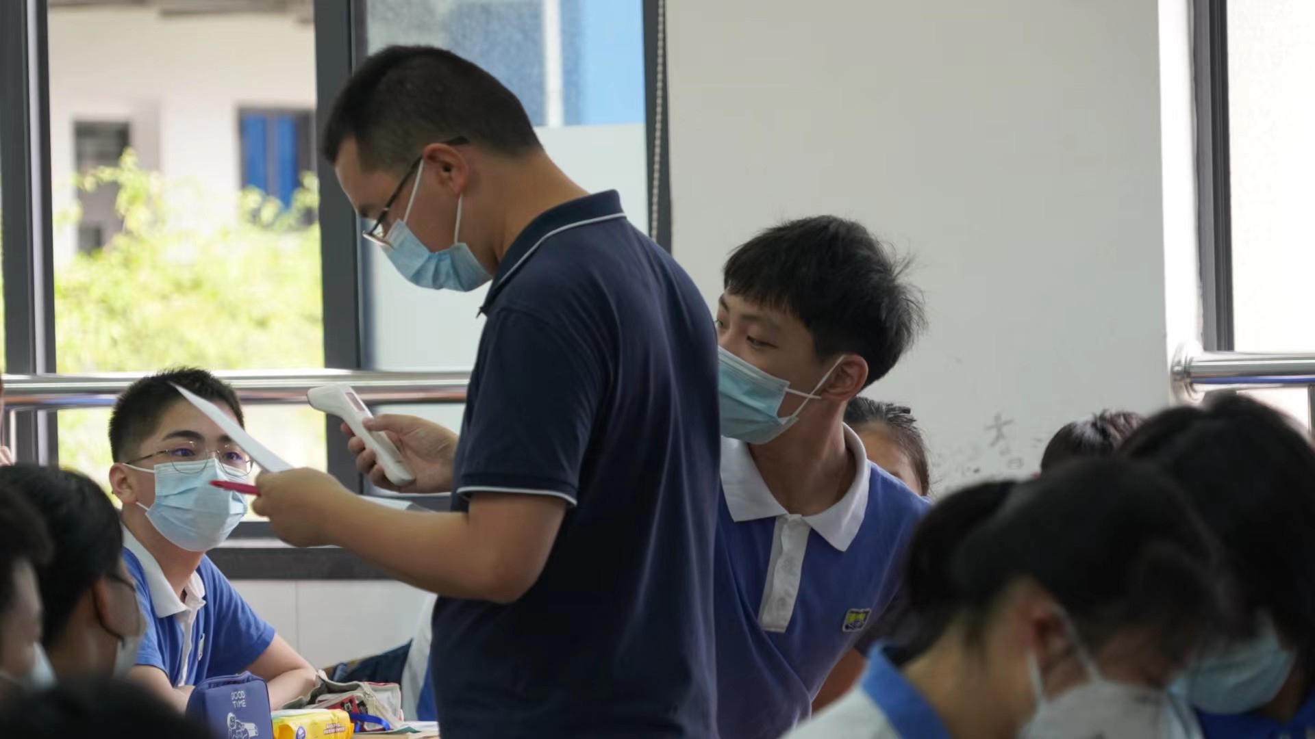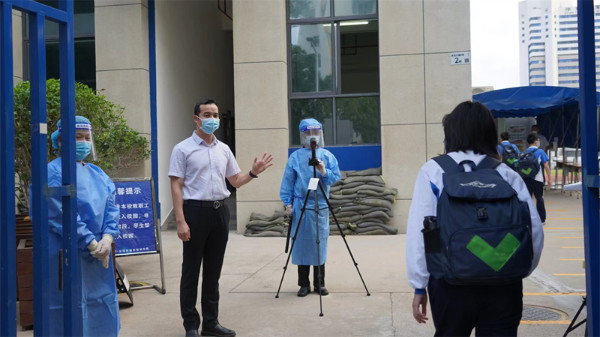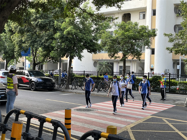 大考当前显担当。初中部党总支党员干部带头提前返岗,严格开展岗位培训。办公室、学生处加强师生“白名单”管理,按照“横向到班无死角、纵向到人不遗漏”的排查思路,全面摸排统计疫情期间师生流动情况和身体健康情况,严格落实“三天三检”“健康申报”“入校查验”“一日常规学习”等工作,通过教师会、班主任会和家长会等,确保各项措施落实、落细、落到位。为确保学生返校后校门口出入安全、有序且高效,学生处联合家委会提升“家校护航队”配置,不仅在十字路口处安排家长组织过往车辆减速慢行,还协助组织学生有序排队、保持间距进入校园。