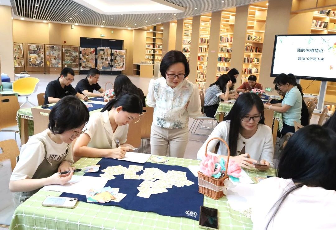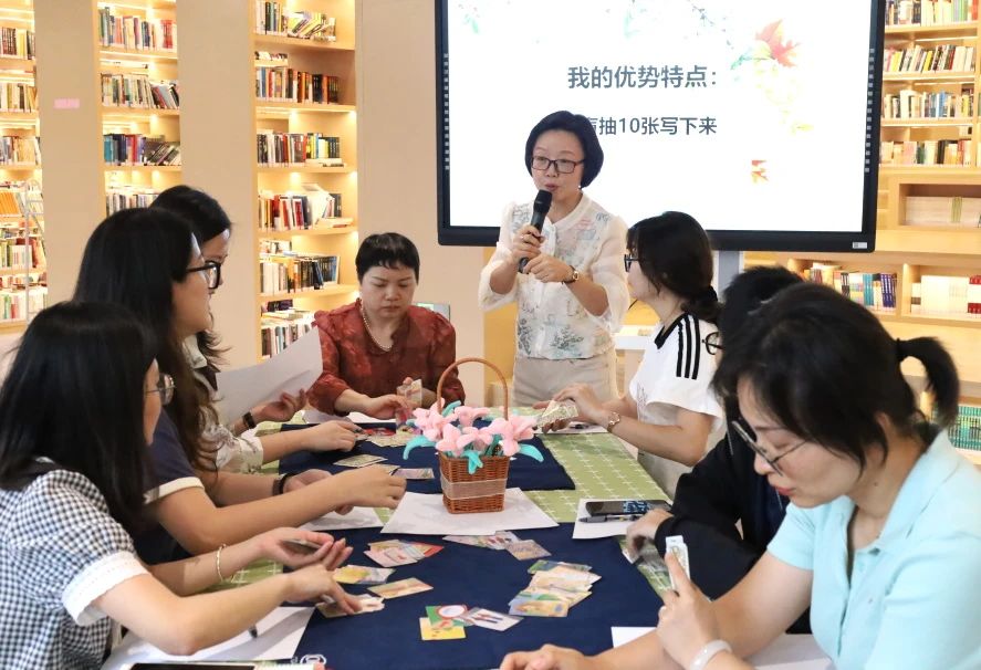 五月的图书馆格外唯美温馨,初中部的老师和家长们在这里分别邂逅了一场OH卡的自我探索和生命成长之旅。教师生命成长工作坊聚焦“自我觉察和关怀”主题,父母生命成长工作坊聚焦“亲子高质量陪伴”主题。大家在孙雅静导师的带领下沉浸式体验每张卡片背后的故事与智慧,在互动体验中与自我对话,给彼此赋能,在心的看见中让爱流动,相伴成长。在父母生命成长工作坊中,我们还有幸邀请到学校家委主任沈奕馨女士为家长们进行宝贵的亲子陪伴经验分享。沈女士以其严谨而朴实的家教家风,以及与孩子高质量相伴成长的有效方法,赢得了在场家长们的广泛赞誉。