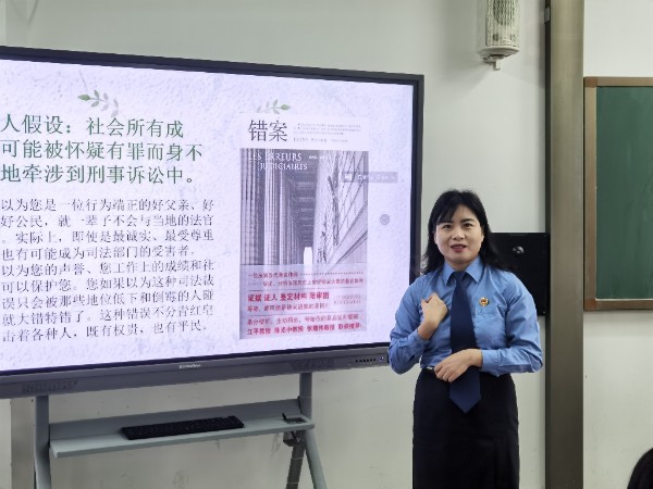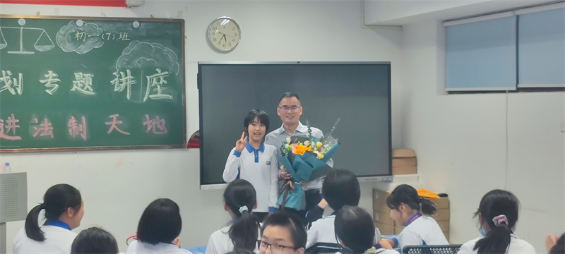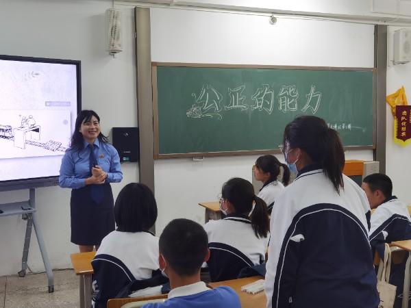 张老师是中国政法大学法学学士,北京大学法律硕士,现任深圳市龙华区人民检察院副检察长。“挥法律之利剑,持正义之天平,除人间之邪恶,守人间之太平。”张老师短短的一句话,字字铿锵有力,让同学们体会她身为一名检察官,手握法律武器所肩负的责任之重。“重证据,看事实,讲法律,讲情怀”是检察官们对于自己的要求,也警示同学们要成为懂法遵法守法用法的人。